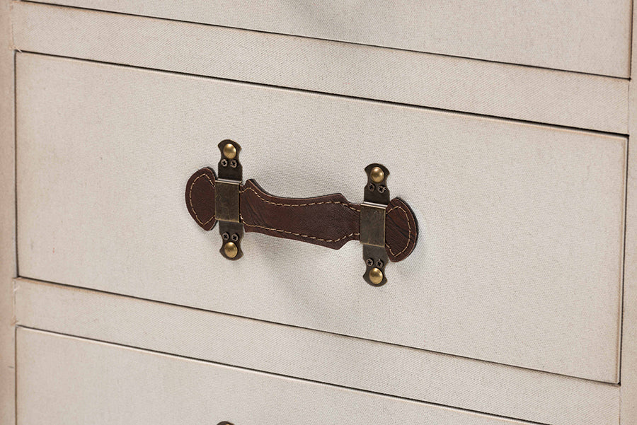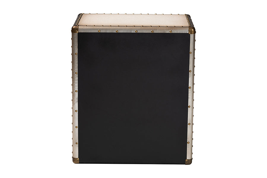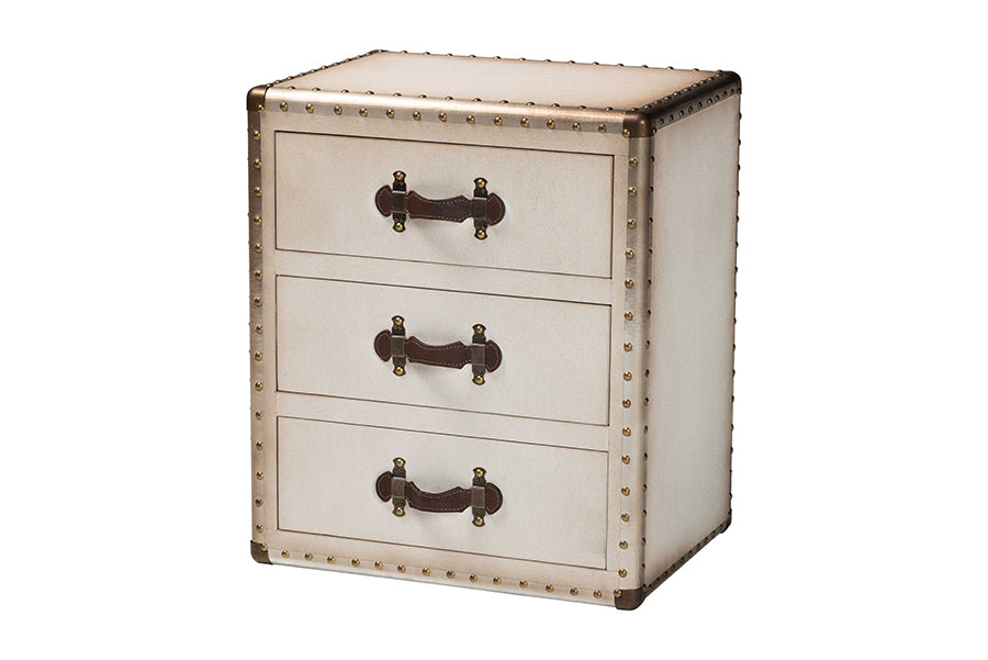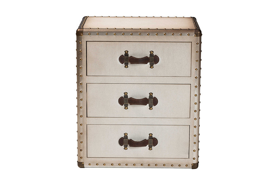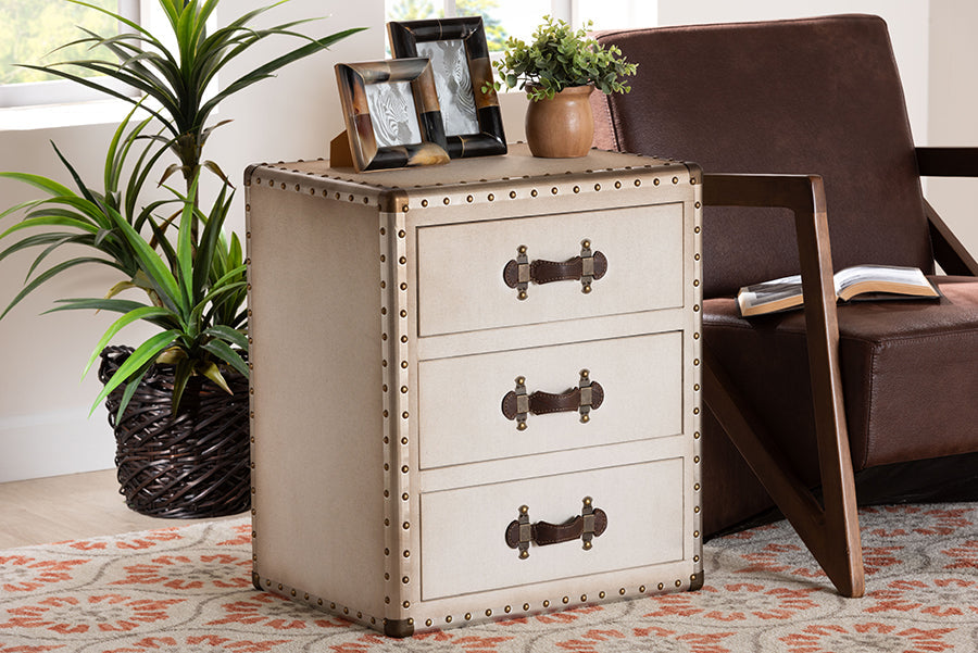 Vintage charm springs forth in the form of the stunning Roze end table. Adeptly crafted in China, this traditional piece consists of a sturdy wood frame wrapped in smooth canvas. Three drawers offer convenient storage for household essentials while reserving the tabletop for daily use. The Roze will arrive fully assembled and is affixed with metal bands studded with nail heads for an extra dose of industrial charm. Faux leather handles complete the look, making the Roze end table an eccentric addition to any setting.