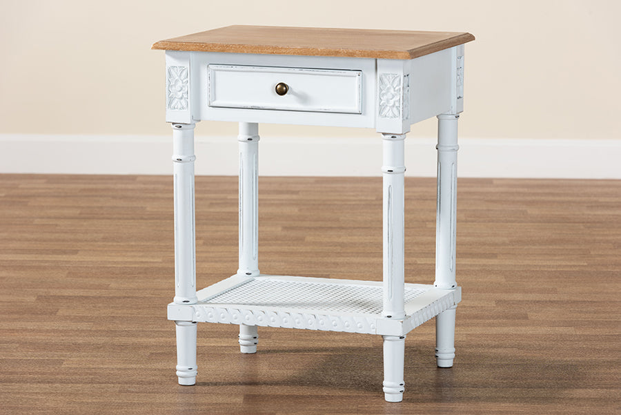 Add an element of vintage beauty to your space with the stunning Rowen end table. Adeptly crafted in China, this French inspired piece is crafted from sturdy wood. The drawer offers convenient storage for household essentials while the woven rattan shelf serves a wonderful display area. The Rowen requires assembly and is beautifully ornamented with floral carvings sure to catch attention. Ring-turned legs accentuate the dynamic geometry of the piece, making the Rowen end table a fantastic addition to any layout.