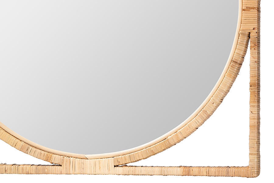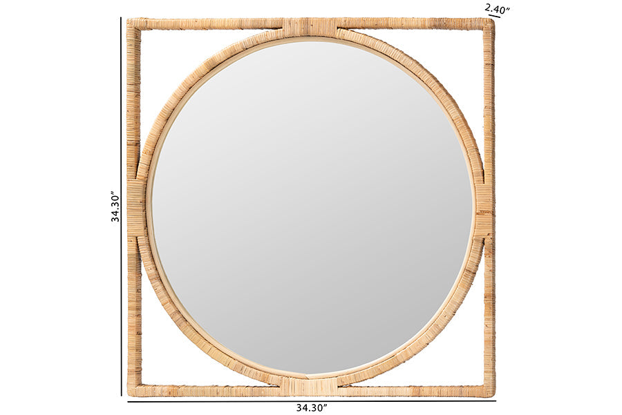 Cultivate a character of exotic grace with the beautiful Alani wall mirror. Made in Indonesia, this Japandi piece consists of a study wood frame elegantly wrapped in natural rattan by skilled artisans. The round mirror is exquisitely bordered by a square silhouette for rich geometric display. The Alani wall mirror will arrive fully assembled and is wall mountable. With a gorgeous display of crisp angles and smooth curves, the Alani wall mirror embellishes any setting.