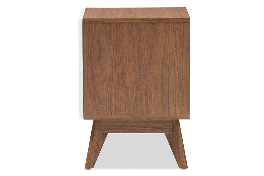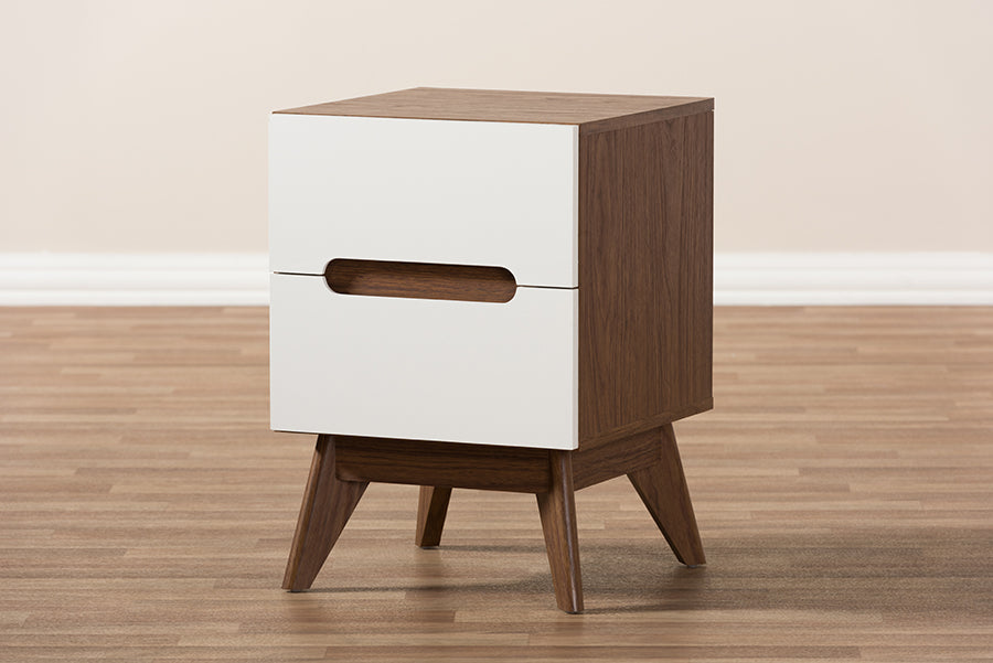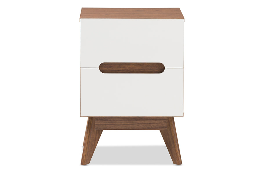 Exude mid-century Scandinavian style in your home with Abbey two-tone 2-drawer nightstand. Showcasing a sleek and simple design with functionality in mind, the Abbey is constructed of engineered wood in walnut and white finishing for lasting good look. Featuring drawers with cut-out handles, contrasting with the walnut wood panel inlaid, the Calyso exudes laid-back luxury and casts a Scandinavian aesthetic over your space. Angular legs complete mid-century look. Two pull-out drawers open to reveal ample storage for small items and bedroom accessories for practicality. Made in Malaysia, the Abbey 2-drawer storage bedside table requires assembly.