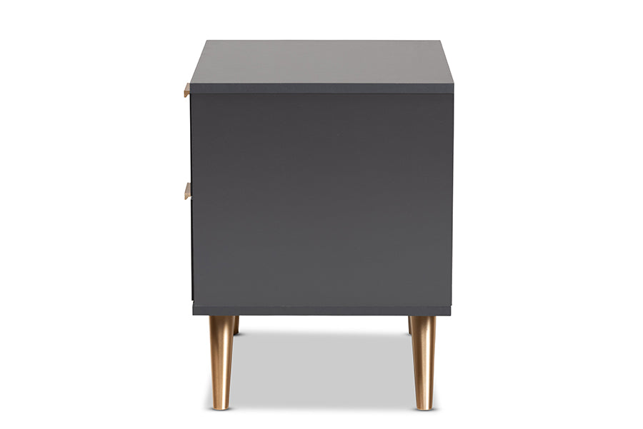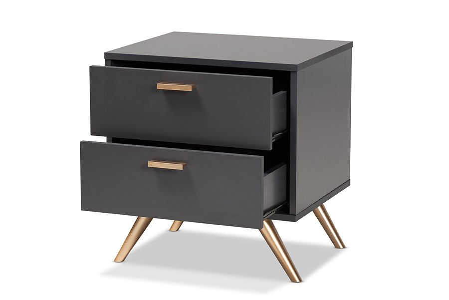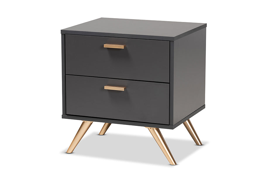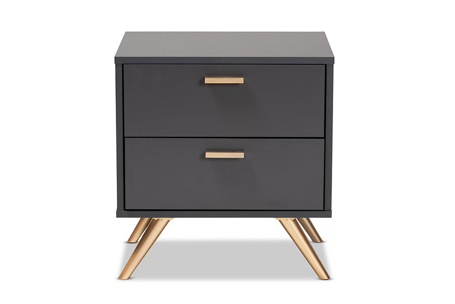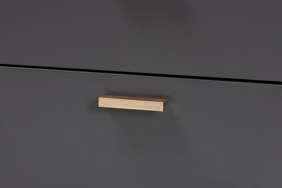 A tasteful expression of modern minimalism, the Yori nightstand is an impressive solution to bedroom storage. Made in Malaysia, the sturdy wood frame of the Yori showcases a dark grey finish that exudes a cool, contemporary character. Two spacious drawers maximize bedroom space with convenient storage for all your bedside essentials. Requiring assembly, the Yori utilizes gold-tone angled legs for stable support with a luxurious touch. Gold handles add an eye-catching touch, making the Yori nightstand a refreshing addition to any space.