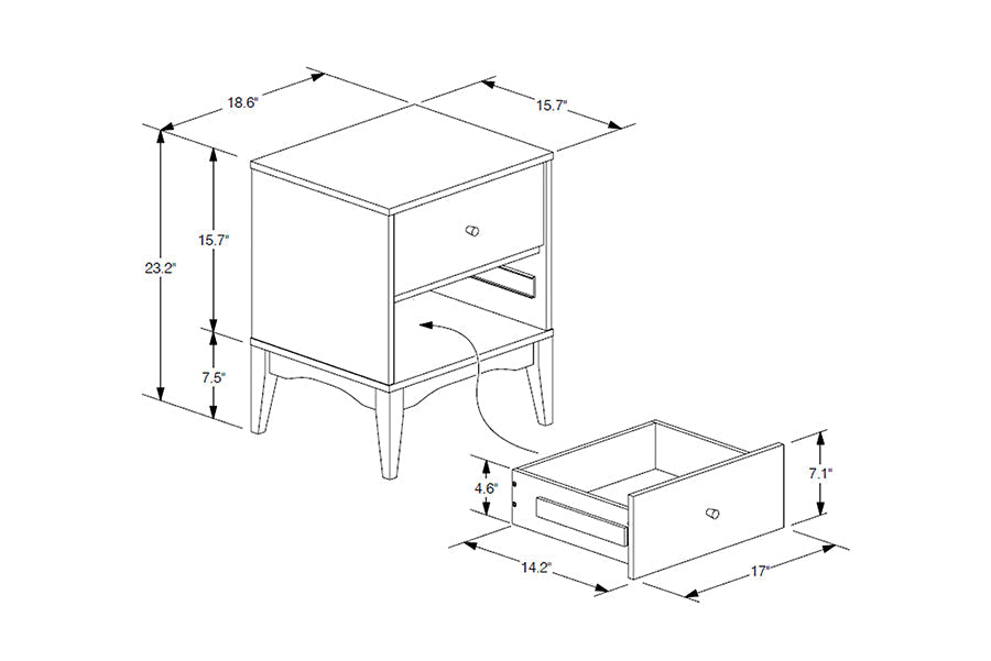 Product Dimensions: Overall Dimensions: 23.20" High x 18.60" Wide x 15.70" Deep; Drawer Dimensions: 15.40" Wide x 13.60" Depth x 4.60" High; Legs: 7.50" High;