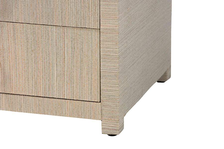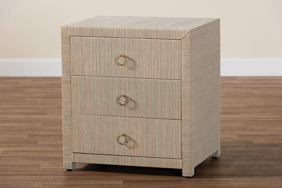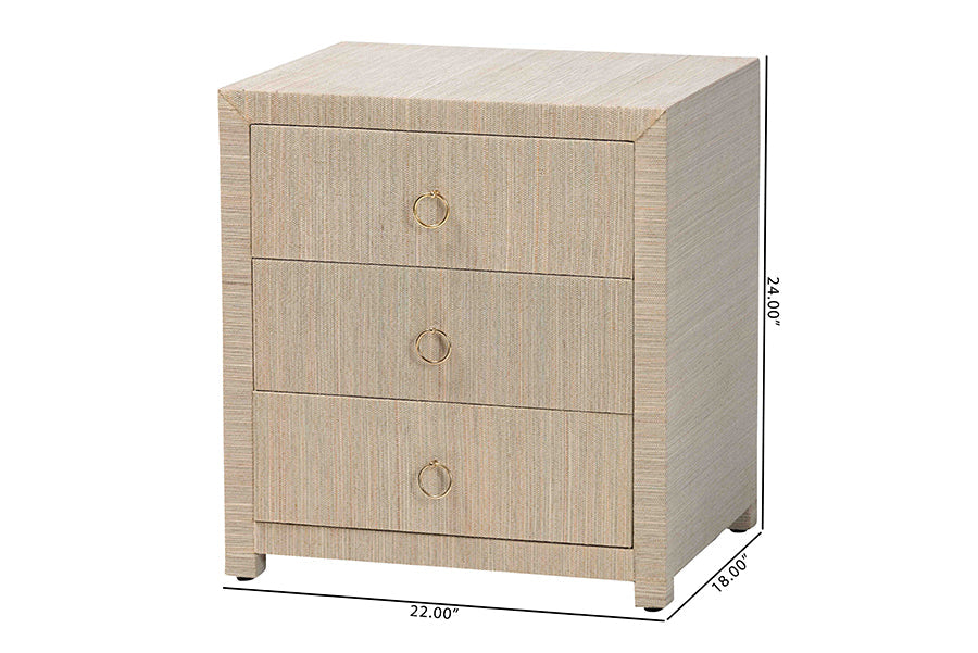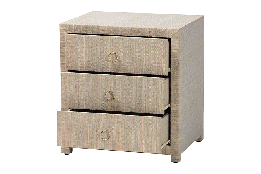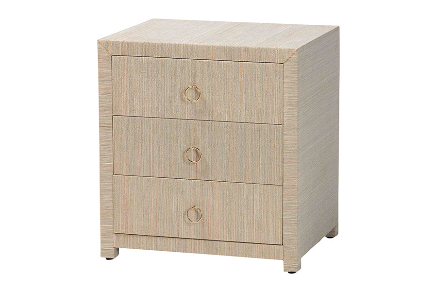 The beauty of the natural world arrives at your bedside with the lovely Rasa nightstand. Meticulously handcrafted by skilled Indonesian artisans, this bohemian piece consists of a sturdy wood frame beautifully embellished with woven natural grasscloth. Three drawers offer easy storage for all your nighttime essentials while reserving the tabletop for daily use. The Rasa will arrive fully assembled and features elegant ring pulls that stand out brilliantly against the woven drawers. With a modest yet vigorous look, the Rasa nightstand elevates any bedroom.