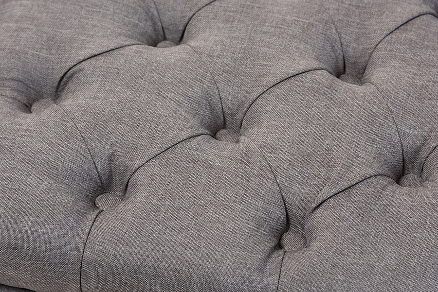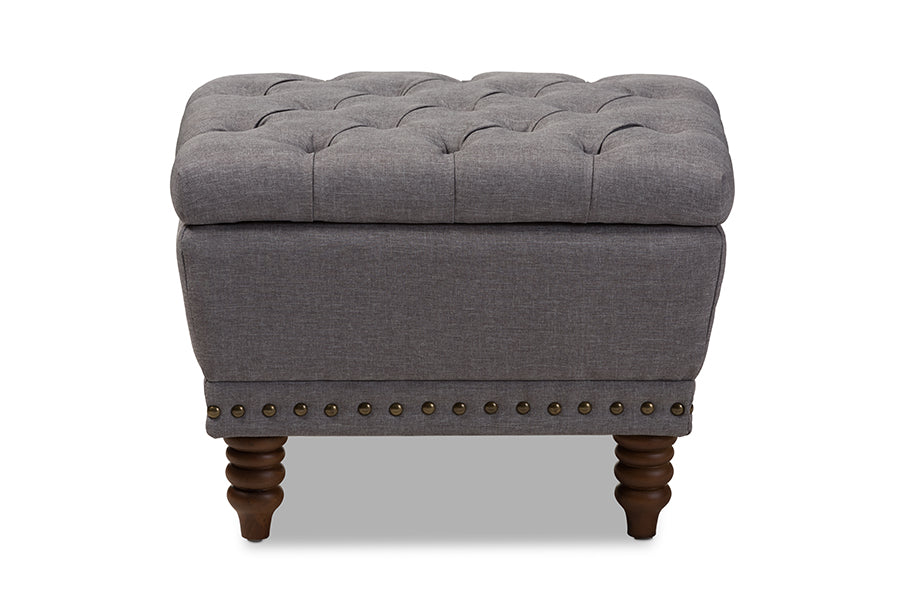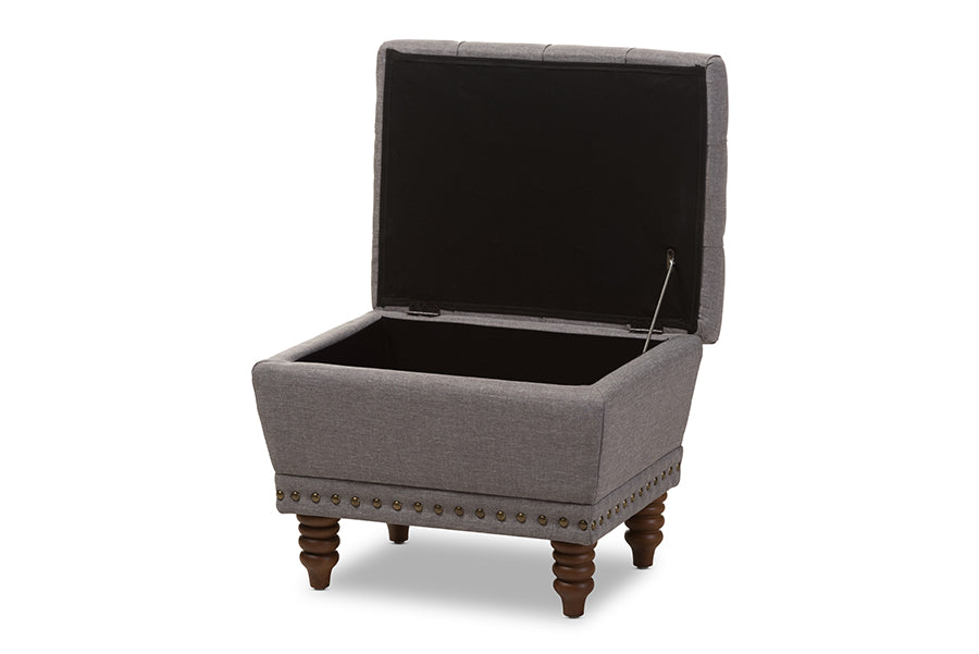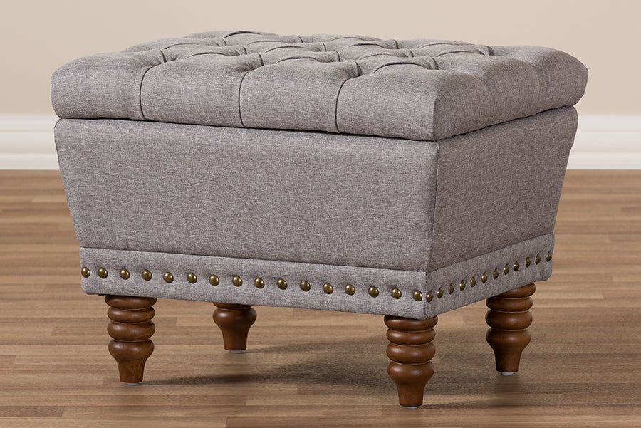 Riona Light Gray Fabric, Walnut Wood Finished Button-Tufted Storage Ottoman