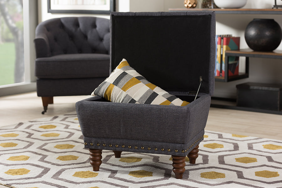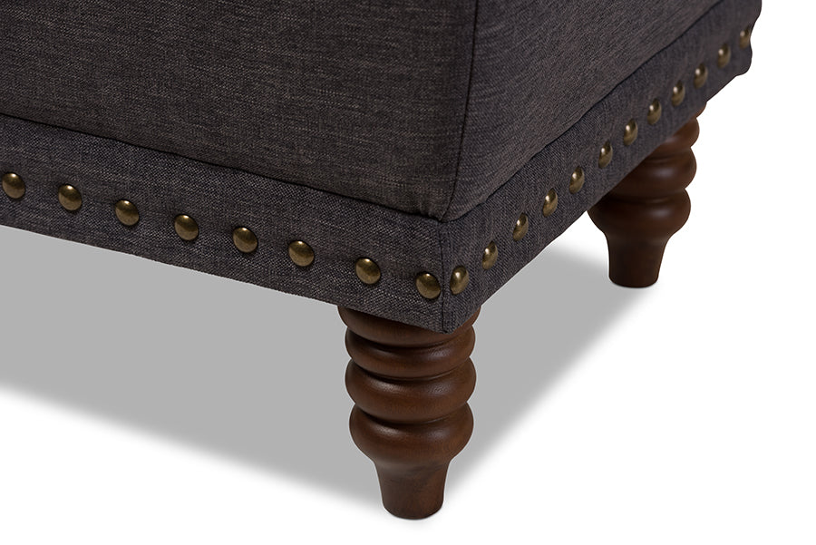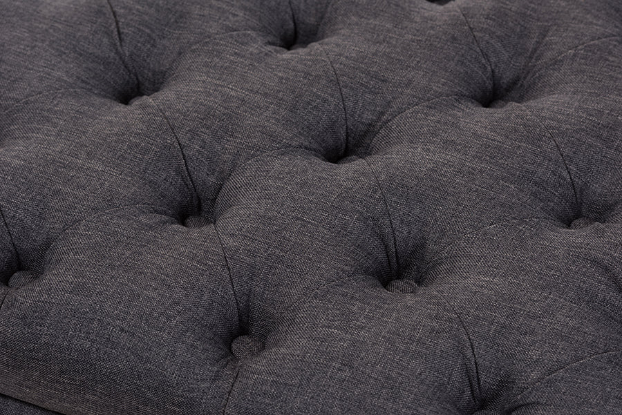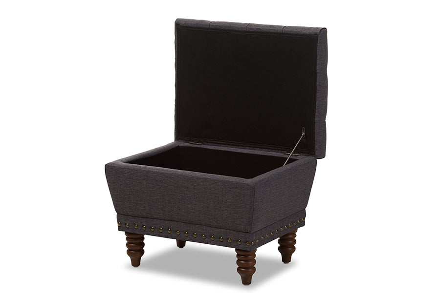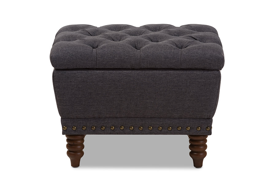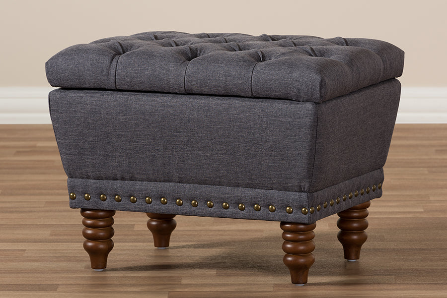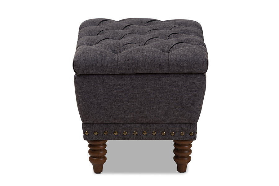 Riona Dark Gray Fabric, Walnut Wood Finished Button-Tufted Storage Ottoman