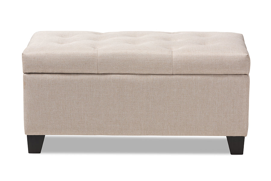 Cute, sturdy, and practical, the Rocco storage ottoman can meet a wide range of your organization needs. The modern and contemporary-inspired design emphasizes simplicity and neutral colors. The Rocco is upholstered in a pleasant beige fabric, with a foam-padded, button-tufted lid. The ottoman features a storage compartment under the lid, made secure with a spring hinge. The Rocco has black finished polymer feet, and can fit easily in many areas. Use this storage ottoman at the edge of a bed, as storage in the guest room, a place for shoes or toys in your entryway - wherever needs to be more tidy! Made in China, the Rocco requires minimal assembly - all you need to do is attach the feet.