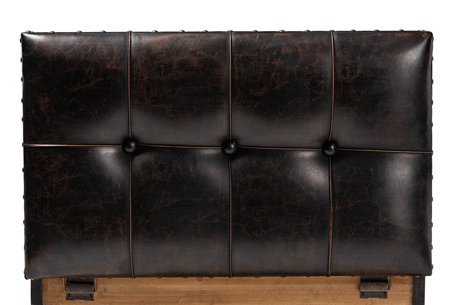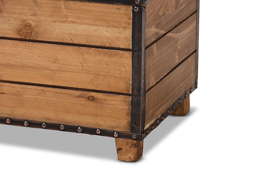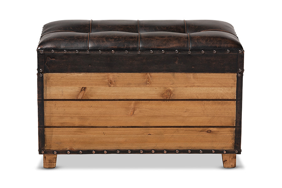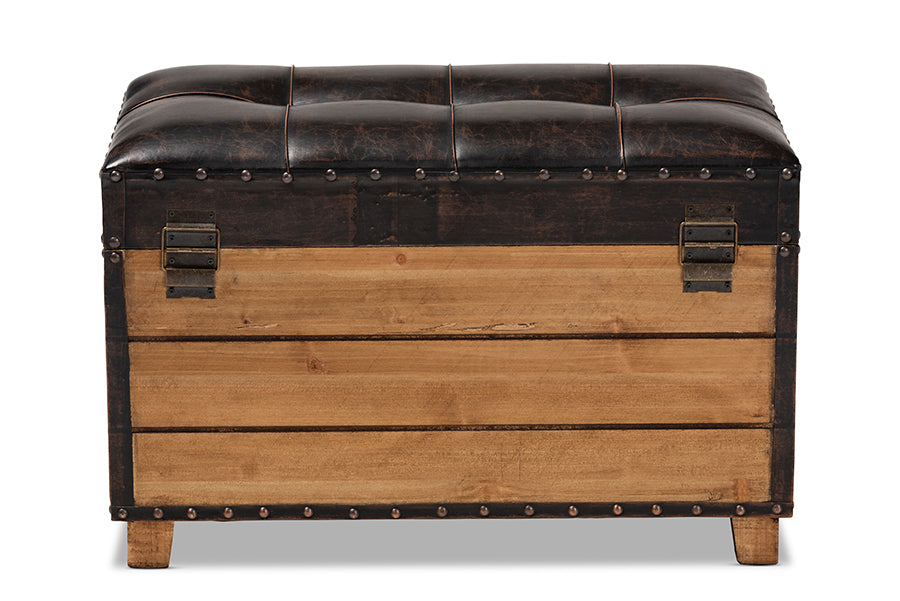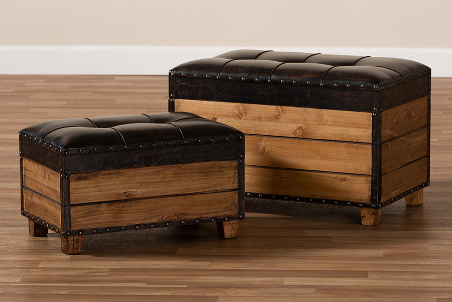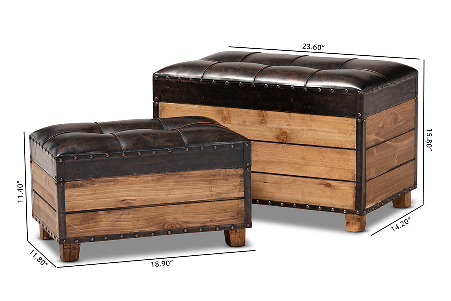 Sennet Rustic Dark Brown Faux Leather 2Pc Wood Storage Trunk Ottoman Set