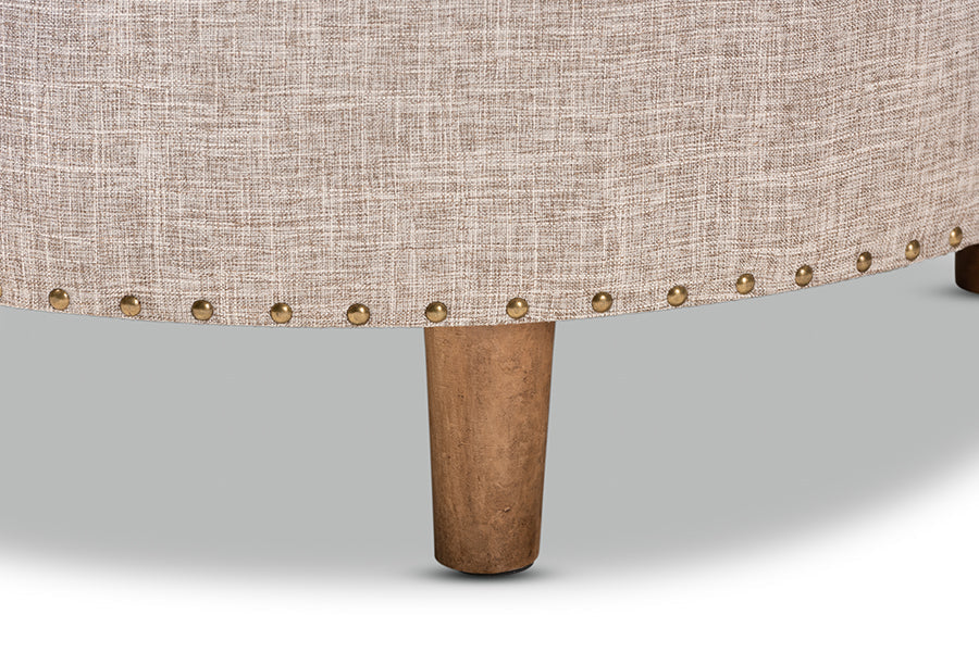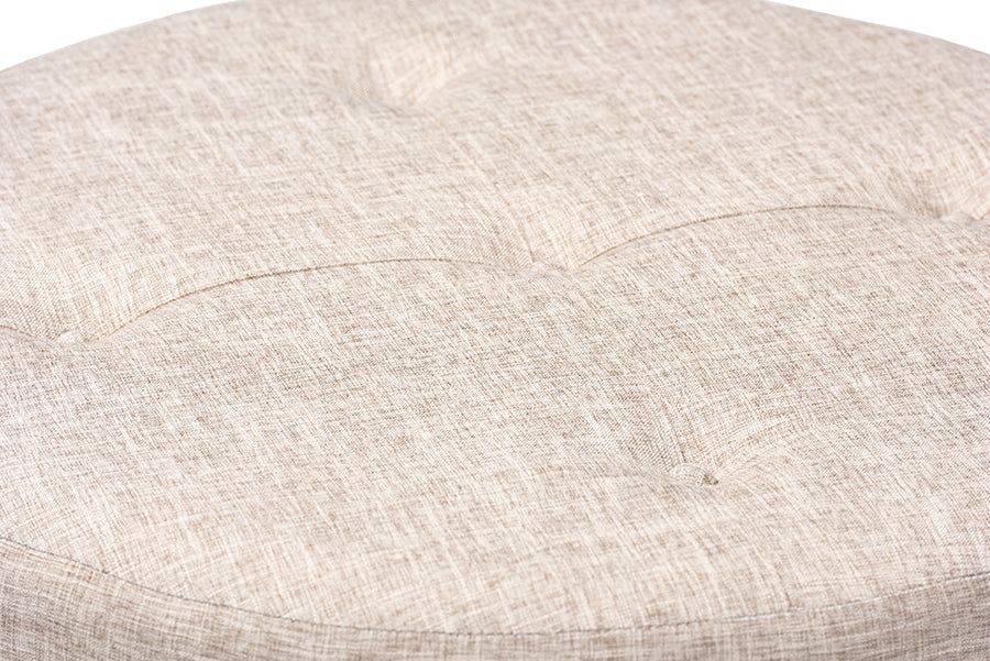 Chic and versatile, the Variel ottoman is designed for the modern home. Constructed from MDF wood, the Variel is upholstered in a soft polyester fabric that displays a subtle crosshatch weave for a natural, earthy feel. The neutral upholstery is complemented by sturdy fir wood legs, which showcase the rustic beauty of the woodgrains. Button tufting on the top and brass nailhead trim along the lower edge add a touch of elegance. Use this versatile piece as a coffee table, footstool, or as extra seating for guests. The Variel ottoman is made in China and requires assembly.