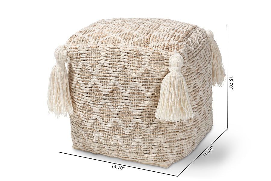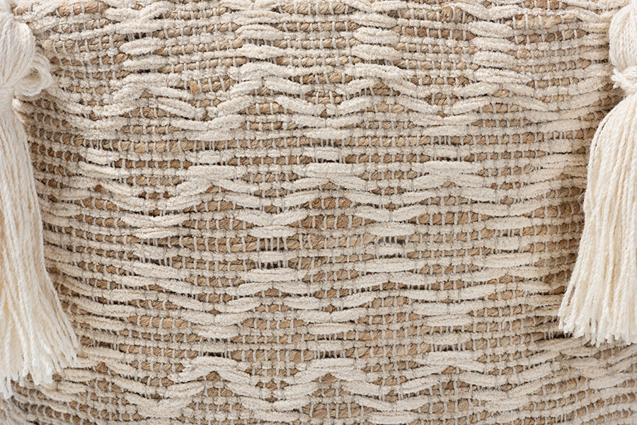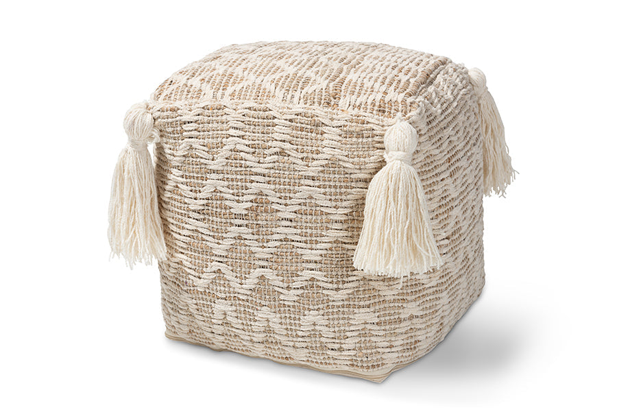 Add a cozy, bohemian touch to any space with the Silvana pouf. Handwoven from cotton, wool, and hemp, the Silvana features natural and ivory tones spun into a striking diamond pattern. Large tassels on the corners of the pouf lend a playful feel. This versatile piece can be used as a seat, footstool, or casual coffee table. Made in India.