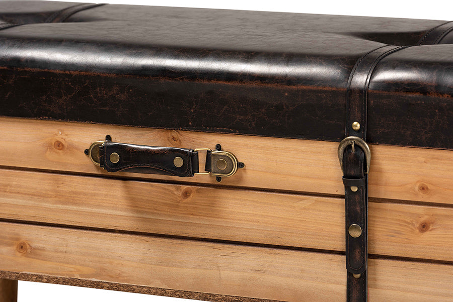 Give your space a hint of rustic flair with the charming Ratu storage ottoman. Made in China, the Ratu is comprised of horizontal wood panels showcasing a warm oak finish. The seat is padded with soft foam and upholstered in smooth PU leather for superb comfort when used as seating. Requiring assembly, its top lifts up to reveal ample storage space for blankets and more. PU leather straps and brass finished metal studs lend a charming, vintage trunk inspired look. Angled legs complete the look, making the Ratu storage ottoman a fantastic addition to the modern home.