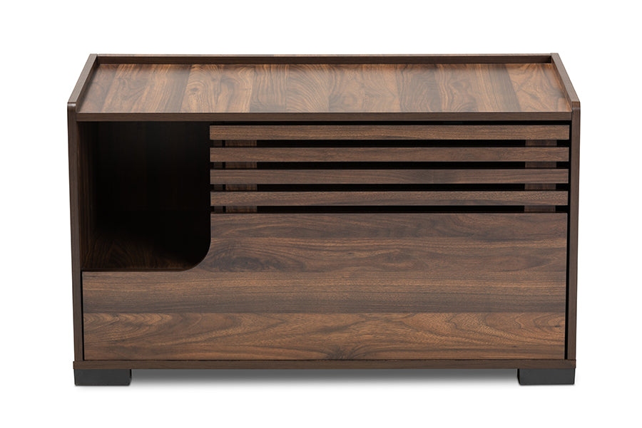 A stylish and versatile design makes the Veve cat house a wonderful addition to any space. Made in Malaysia, this convenient piece acts as a secluded place for a litter box and is fitted with a front entrance to provide your cat easy access. The Veve is also equipped with a storage compartment underneath the entrance, making it ideal for storing treats or pet supplies. Assembly is required and walnut brown finished wood gives the Veve a contemporary look that fits well in the modern household. Organize your cat’s life with the utility of the Veve cat house. A litter box is not included.