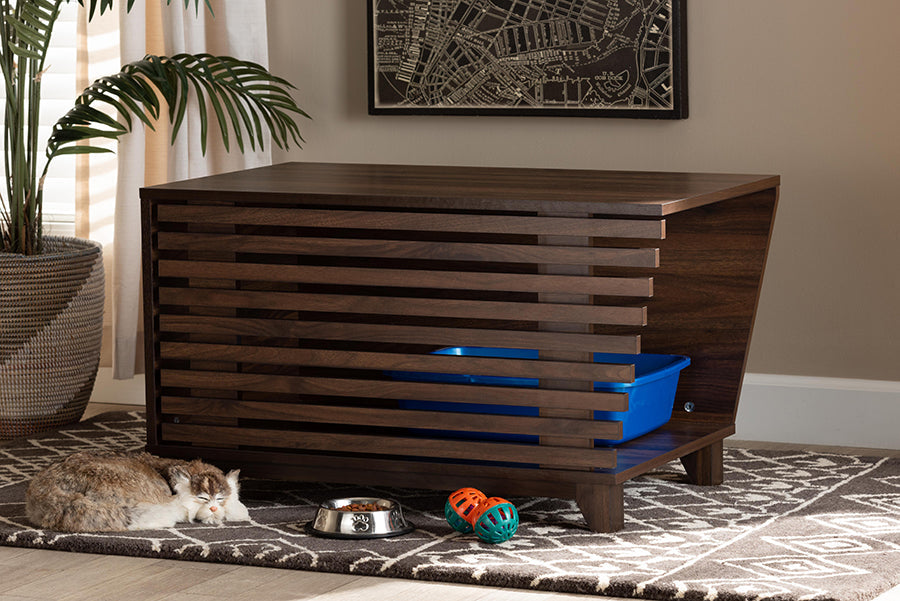 Enrich the life of your cat with the terrific design of the Reagan cat house. Made in Malaysia, this piece is constructed from sturdy wood. It features a secluded place for a litter box as well as a convenient side entrance for your cat to access. Requiring assembly, the Reagan features a slatted wood design that disperses odors and allows air to circulate. A versatile and fashionable enhancement for both owners and cats, the Reagan cat house is a fantastic addition to any pet-friendly home.