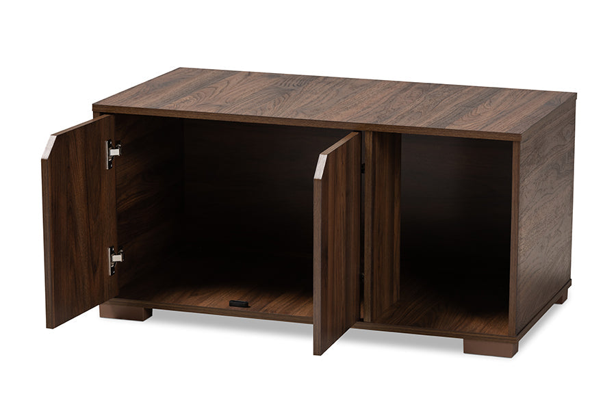 Smart and practical, the Sante house keeps that unpleasant litter box tucked away. Built from sturdy wood, the Sante showcases a sleek walnut brown finish that complements any interior color palette. Two doors provide easy access to clean the litter box, while an open space adjacent to the doors allows your cat to come and go as they please. Featuring a clean, modern design, the Sante is well suited for any space. The Sante house is made in Malaysia and requires assembly.