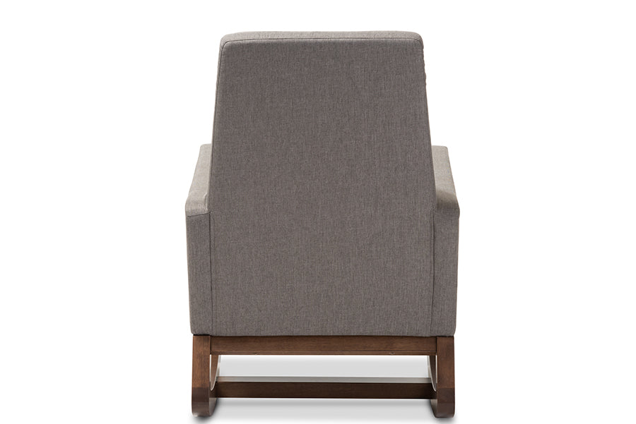 Inspired by mid-century modern design, the Roana rocking chair has blended the retro feel of a vintage upholstered rocking chair with the quality, made-to-last design you'd expect from a modern piece of furniture. The result is our exclusive Roana Rocking Chair. Featuring polyester fabric in grey and a sturdy wood frame in a beautiful walnut finishing, this retro rocking chair feels right at home in a nursery, living room or any shared space. High back contoured design and ergonomic arm height add more charms to this piece. The Roana looks smart, modern, but comfortable can be a good rocking chair for nursery during middle of the night feedings and yet a pretty piece of furniture to accent the room. Made in Malaysia, the Roana requires assembly.