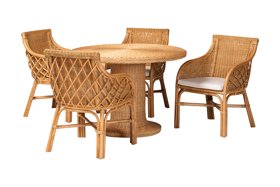 Bring the essence of paradise to your home with the lovely Tucson dining set. Made in Indonesia, this bohemian piece includes one table and four chairs handcrafted from sustainably sourced natural rattan. Each chair features elegant arms for added comfort while shaped rattan pole adorns the backrest for an enchanting display from every angle. The Tucson will arrive fully assembled and features a round tabletop embellished with beautifully braided rattan bands for added flair. Flowing with exotic artistry, the Tucson dining set is a refreshing arrangement.