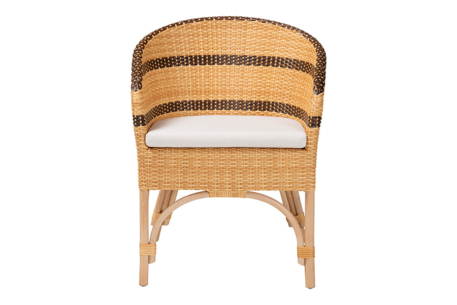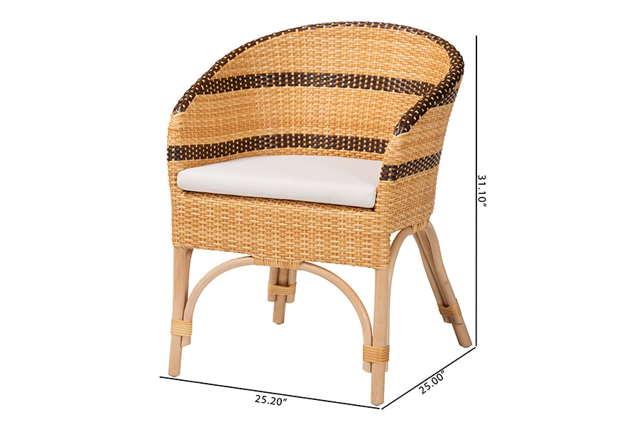 The essence of exotic beauty radiates from the lovely Anderson dining chair. Made in Indonesia, this bohemian piece consists of a natural rattan frame elegantly adorned with synthetic woven rattan. Its round backrest gently curves around the seat to form cozy, sloping armrests for enhanced comfort. The Anderson will arrive fully assembled and is fitted with a removable seat cushion padded with plush foam and upholstered in soft fabric. A remarkable blend of rustic design and modern imagination, the Anderson dining chair uplifts any setting.