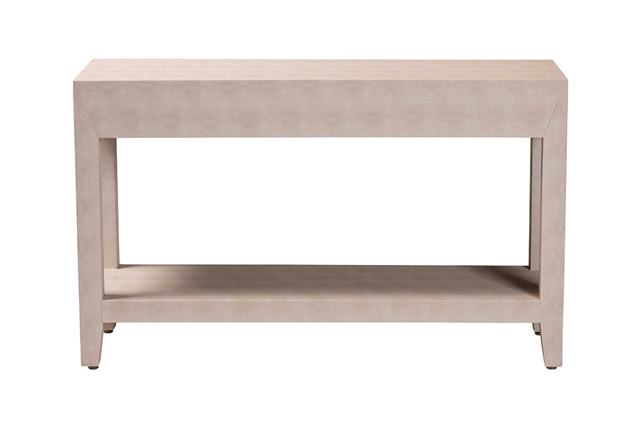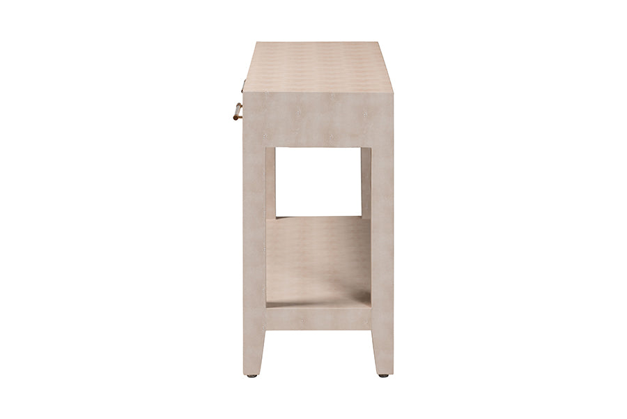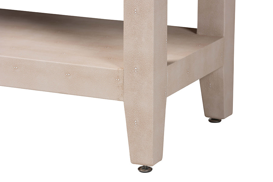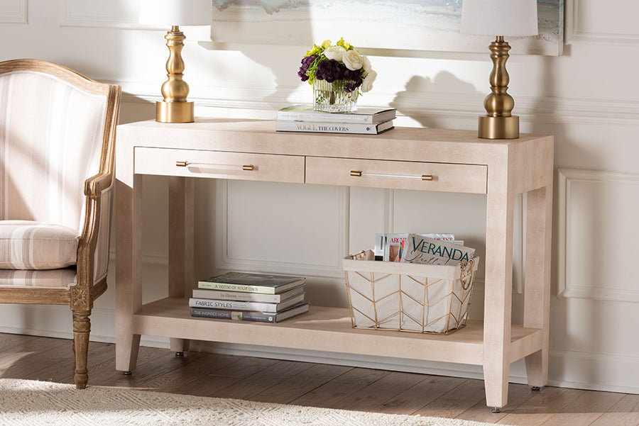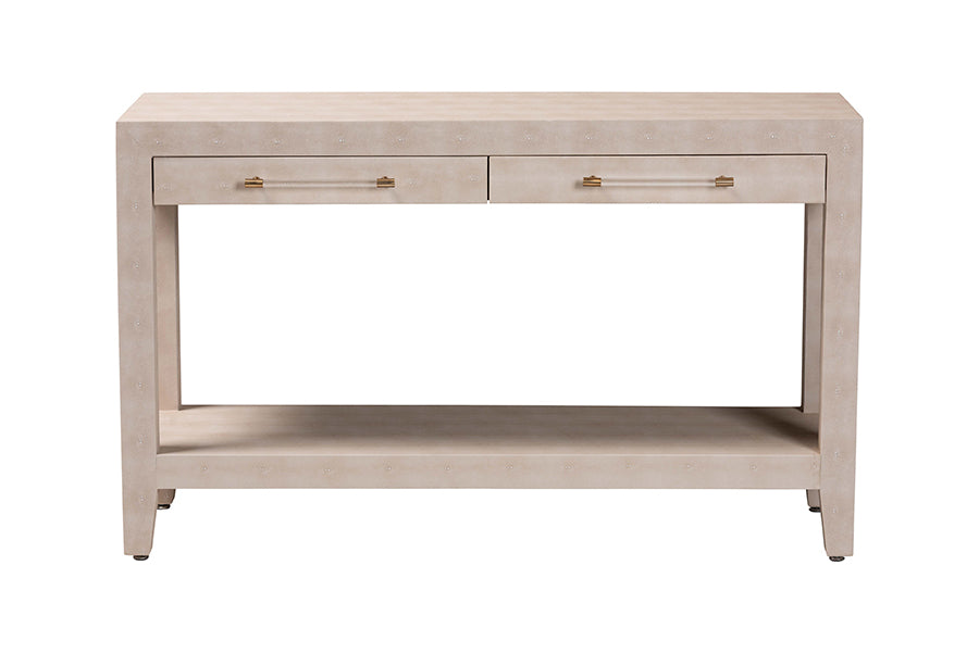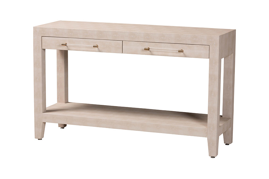 The Sydney console table exudes avantgarde character while bringing versatility to any layout. Adeptly crafted in China, this chic piece consists of a sturdy wood frame wrapped in faux shagreen for a captivating display rich with the unique granular texture of the material. Two drawers offer convenient storage while the open shelf and wide tabletop serve as fantastic display areas. The Sydney will arrive fully assembled and is fitted with graceful handles that brilliantly stand out against the shagreen. Tapered legs complete the graceful look, making the Sydney console table a remarkable household fixture.