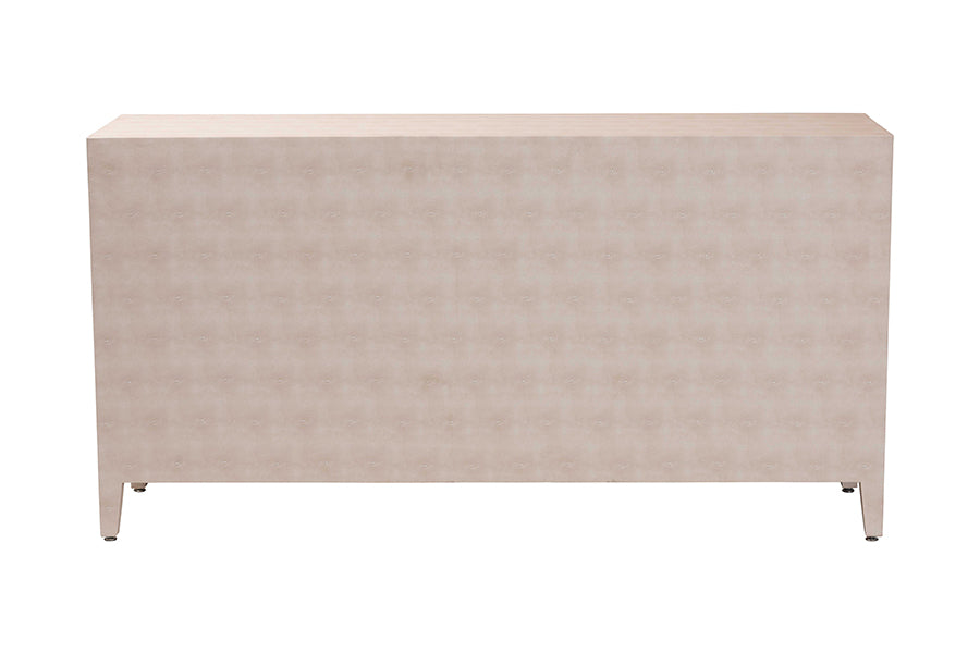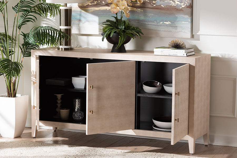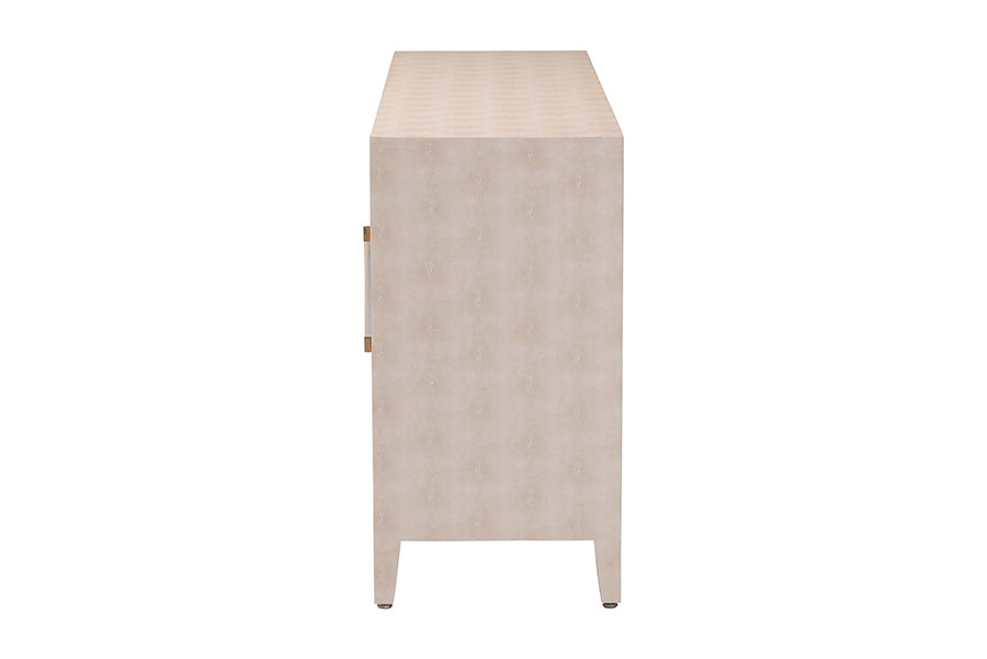 The Sydney storage cabinet exudes avantgarde character while bringing versatility to any layout. Adeptly crafted in China, this chic piece consists of a sturdy wood frame wrapped in faux shagreen for a captivating display rich with the unique granular texture of the material. Two spacious interior shelves offer space to organize and declutter a variety of layouts while reserving the tabletop as a fantastic display area. The Sydney will arrive fully assembled and is fitted with graceful handles that brilliantly stand out against the shagreen. Tapered legs complete the graceful look, making the Sydney storage cabinet a remarkable household fixture.