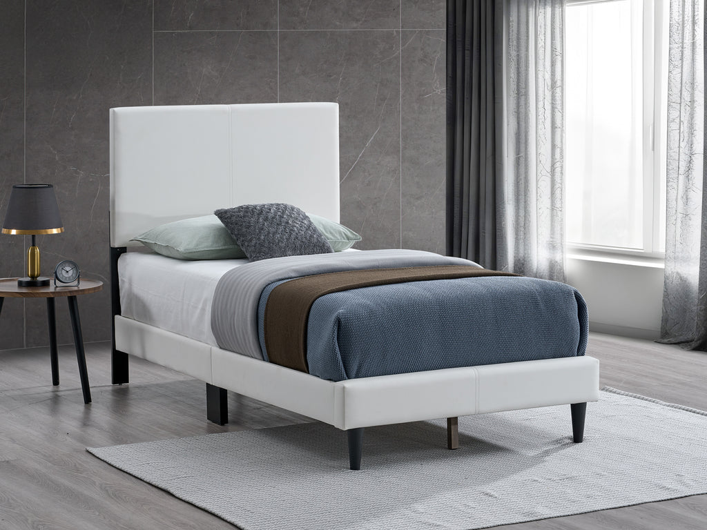 The Baron Platform Bed captures a modern look with its precisely tailored, faux leather upholstery and thoughtfully designed headboard. Subtle details and a clean profile combine to create a bedroom statement that easily blends with contemporary and transitional décor. This twin bed incorporates an adjustable headboard, letting you choose optimal height for comfort whether sitting up to read or lounging. Its curated design suits rooms with limited space, supporting a mattress thickness between 7 and 13 inches while providing a supportive sleeping experience for one. Pair this piece with coordinating accent tables or dressers from the line to create a cohesive, inviting ensemble in your home.
