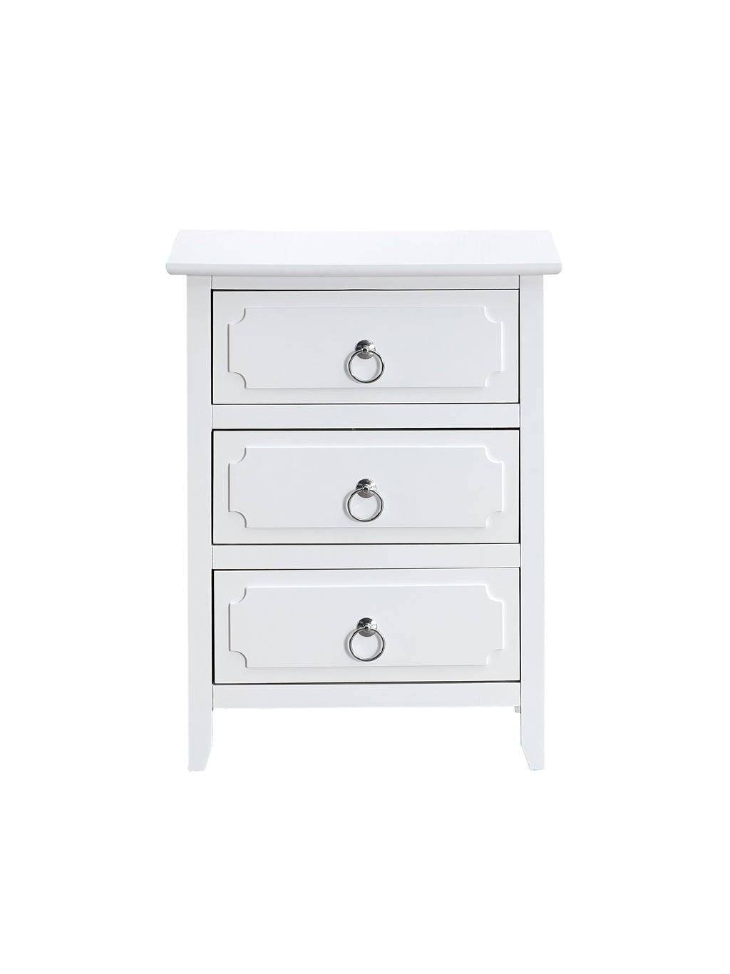 Crafted from a blend of solid and manufactured wood, this fully assembled 3-drawer nightstand offers both durability and convenience. Featuring polished nickel hardware and removable handles, it allows for easy customization to suit your style. Each drawer is equipped with center-mounted guides and safety stops for smooth, secure operation. With its clean design and practical storage, this nightstand is a versatile addition to any bedroom.