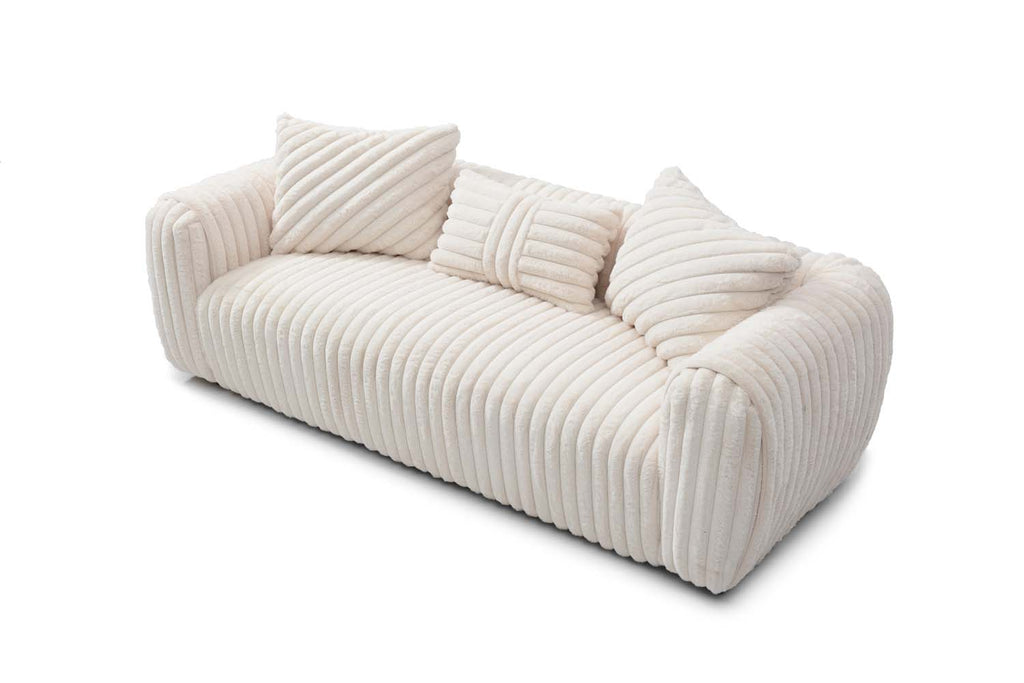 Features a soft white boucle fabric that feels refined and adds an inviting tone to any living space. Overall dimensions are well-suited for open rooms, offering versatility and comfort. Solid construction and plush cushions ensure strong support and a relaxing seating experience. Back pillows are filled to maintain loft, offering lasting comfort and minimal fluffing required. Generously sized seat and back cushions provide supportive seating for family or guests.