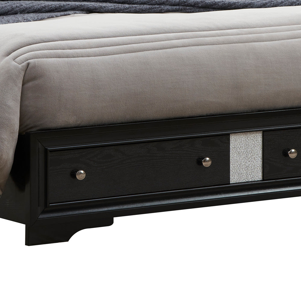 This bed combines modern simplicity with practical design. A sleek, panel-style headboard features a textured accent strip for added visual interest, while the footboard includes spacious built-in drawers to keep linens, clothing, or essentials neatly organized. Clean lines and a sturdy profile make this bed a functional and stylish centerpiece for any bedroom.