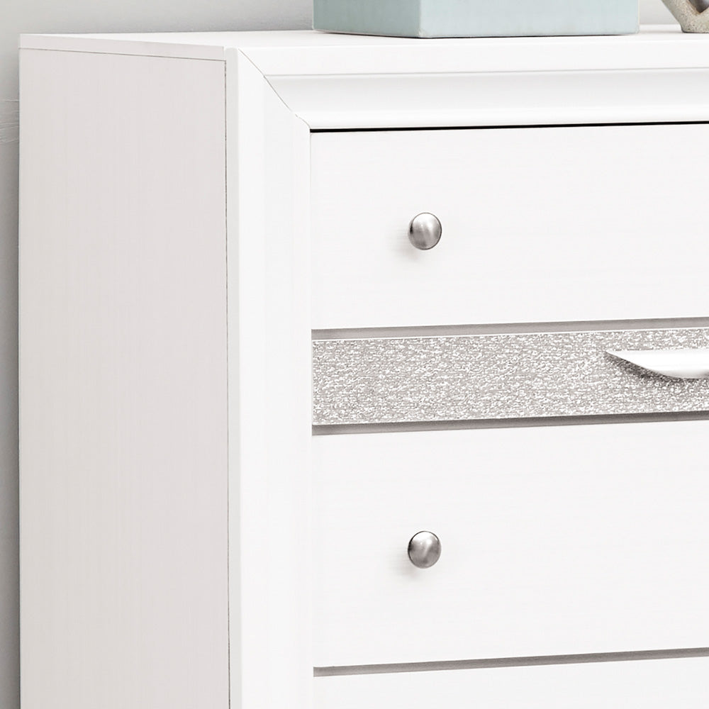 This five-drawer chest combines stylish detail with convenient storage, making it a standout addition to any bedroom. Designed with clean lines and subtle decorative accents, it offers a refined look that pairs beautifully with a wide range of décor styles. The spacious lower drawers provide ample room for clothing, linens, and everyday essentials, helping keep your space neat and organized. The top drawer includes built-in dividers, making it ideal for accessories, jewelry, or smaller items that need careful separation. Smooth drawer operation ensures easy access, while the sturdy construction provides long-lasting use. Whether placed in a primary suite or guest room, this chest delivers both function and visual appeal, offering a practical solution for maintaining a tidy and stylish environment.