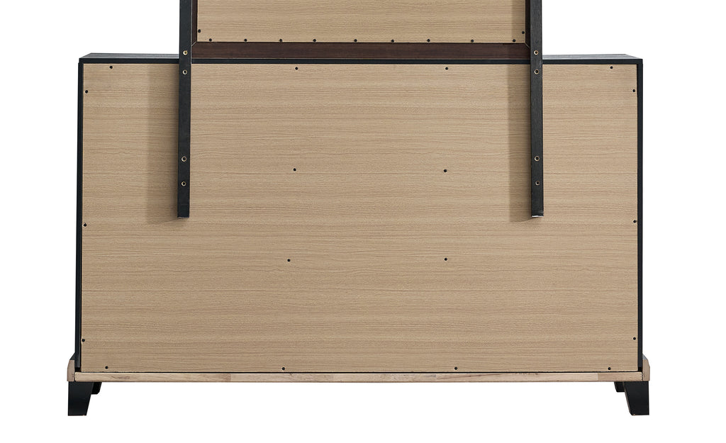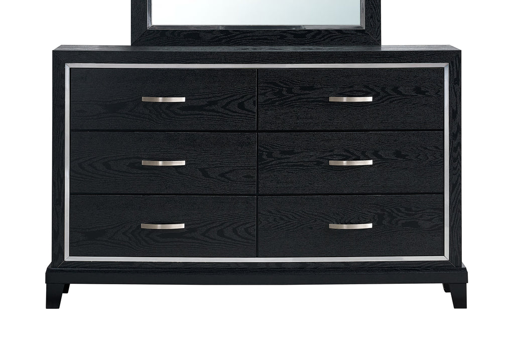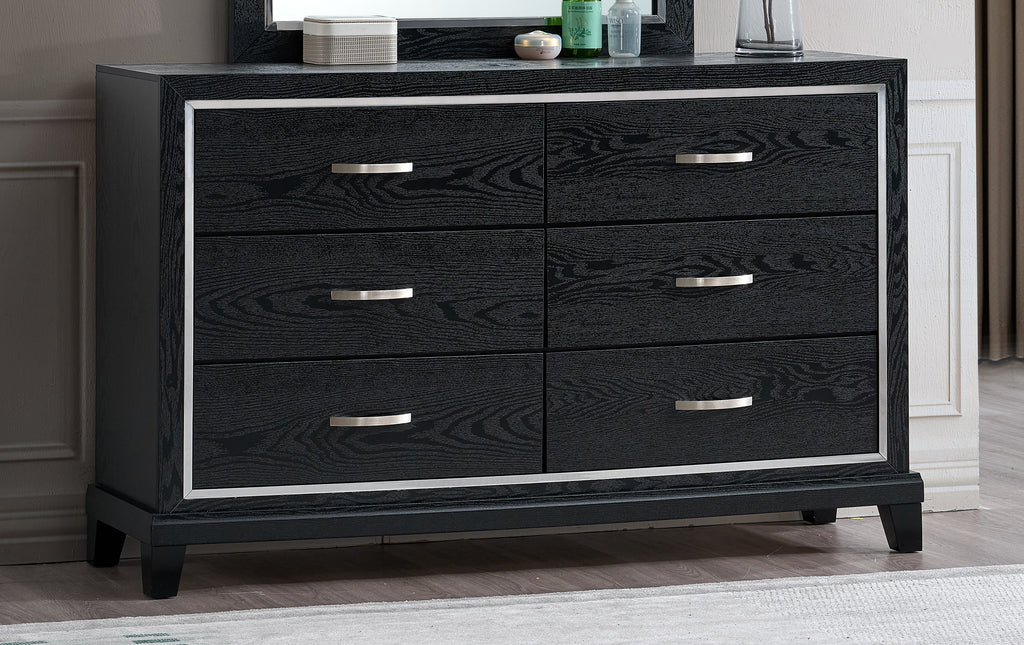 This six-drawer dresser showcases refined design with bold black surfaces and understated brushed hardware, making it a versatile addition to modern or transitional bedrooms. Accented drawer fronts and simple styling create a look that feels both fresh and timeless. The dresser features deep drawers offering generous room for clothing and essentials, while quiet-glide slides ensure smooth operation each day. Its substantial frame delivers a sense of stability, and the wide top provides space for decor or daily necessities. Subtle grain detailing adds visual interest without overwhelming the space. Complete your bedroom set with a coordinating nightstand or bed from the same collection for a unified appearance. Please note: Mirror Not Included