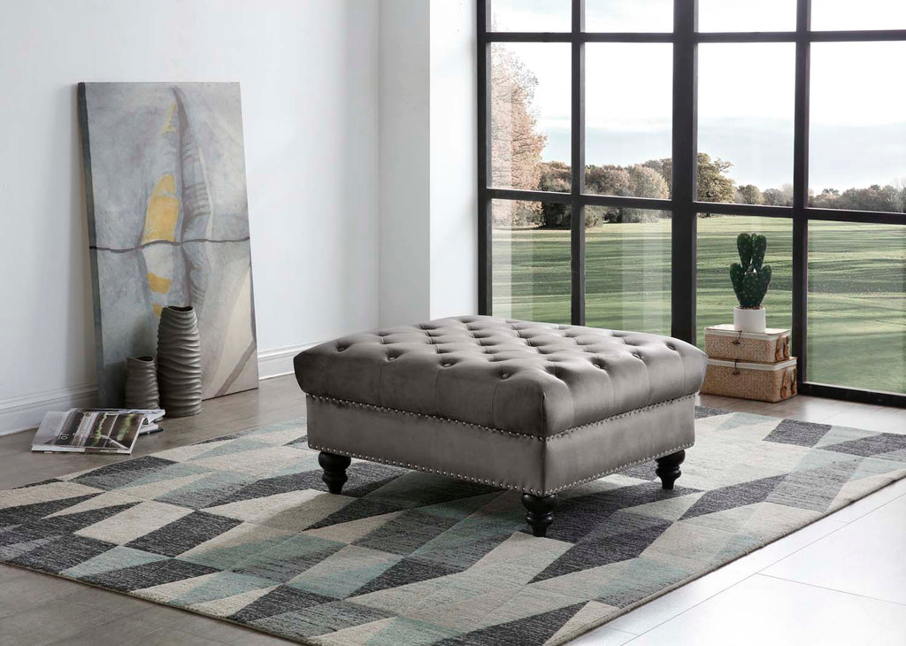 Jumbo Tufted Ottoman covered in Soft Plush Velvet. Chrome Nailheads and Wood Legs with Brass Paint Accents finish off this Classic look.