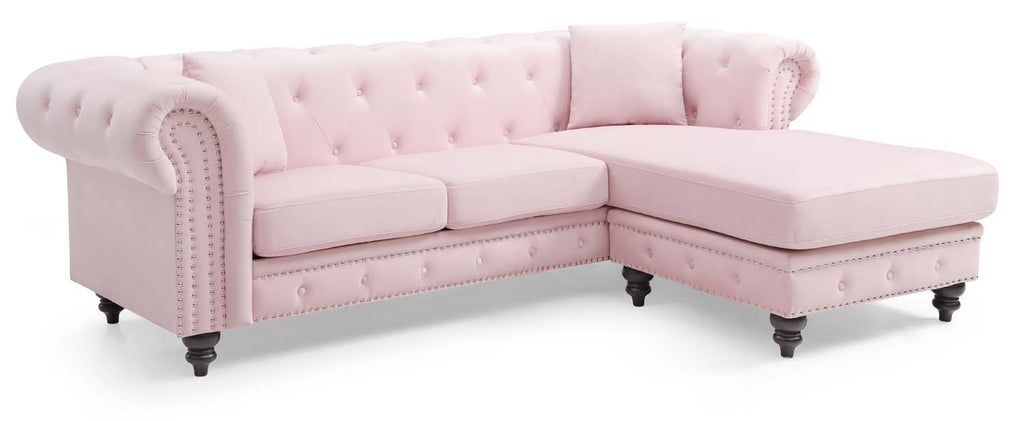 Dramatic Chesterfield Sectional that can be set up as Left or Right Facing features Soft Velvet Cover Tufted On Front and back as well as Bottom Rail. Chrome Nail-heads and Wood Legs are also included. Pocketed Coil Seating provides a medium Firm feel with long lasting durability. Two Matching Throw Pillows are also included. Available in a choice of colors as well as a Matching Ottoman can be purchased separate.