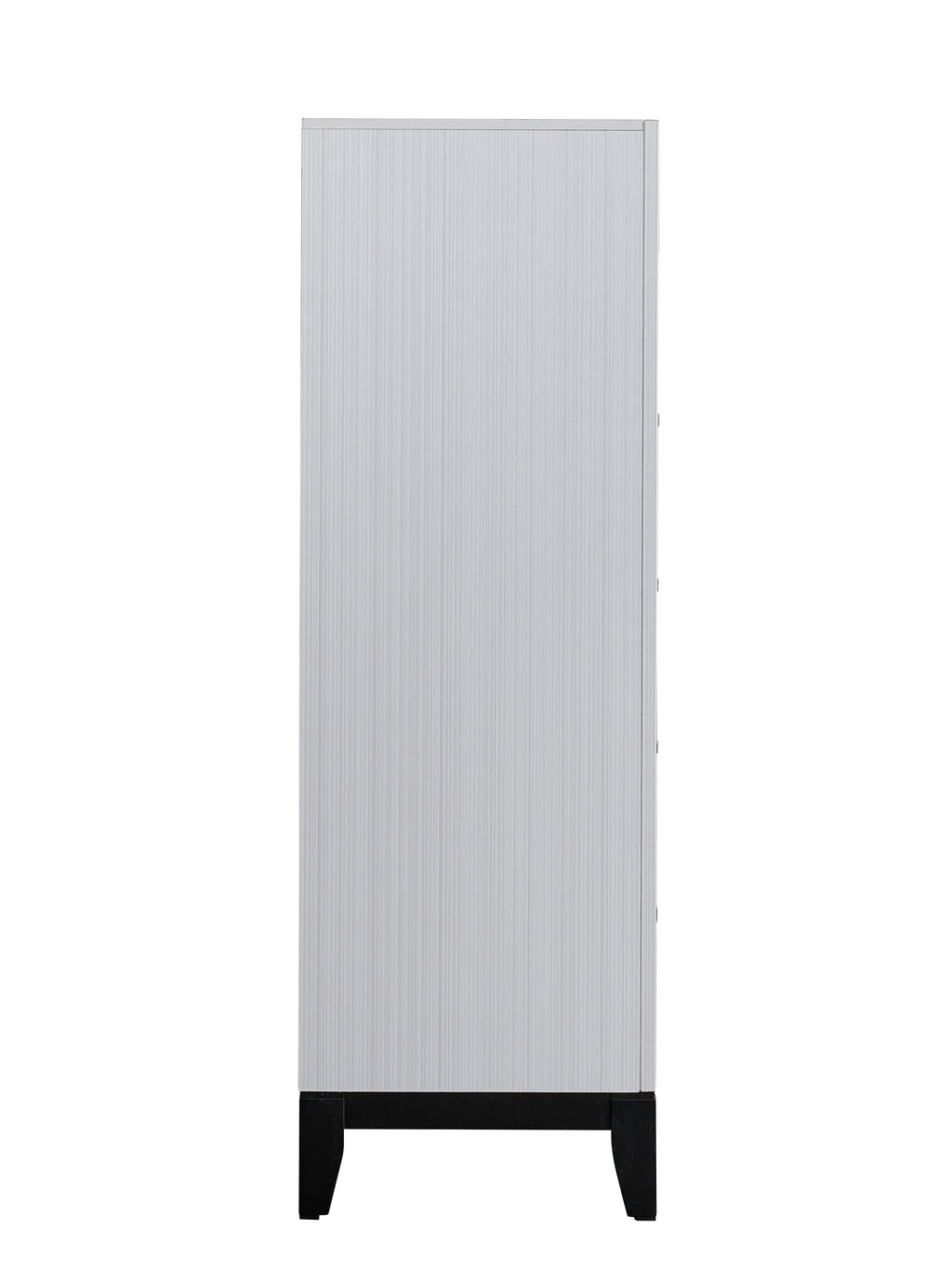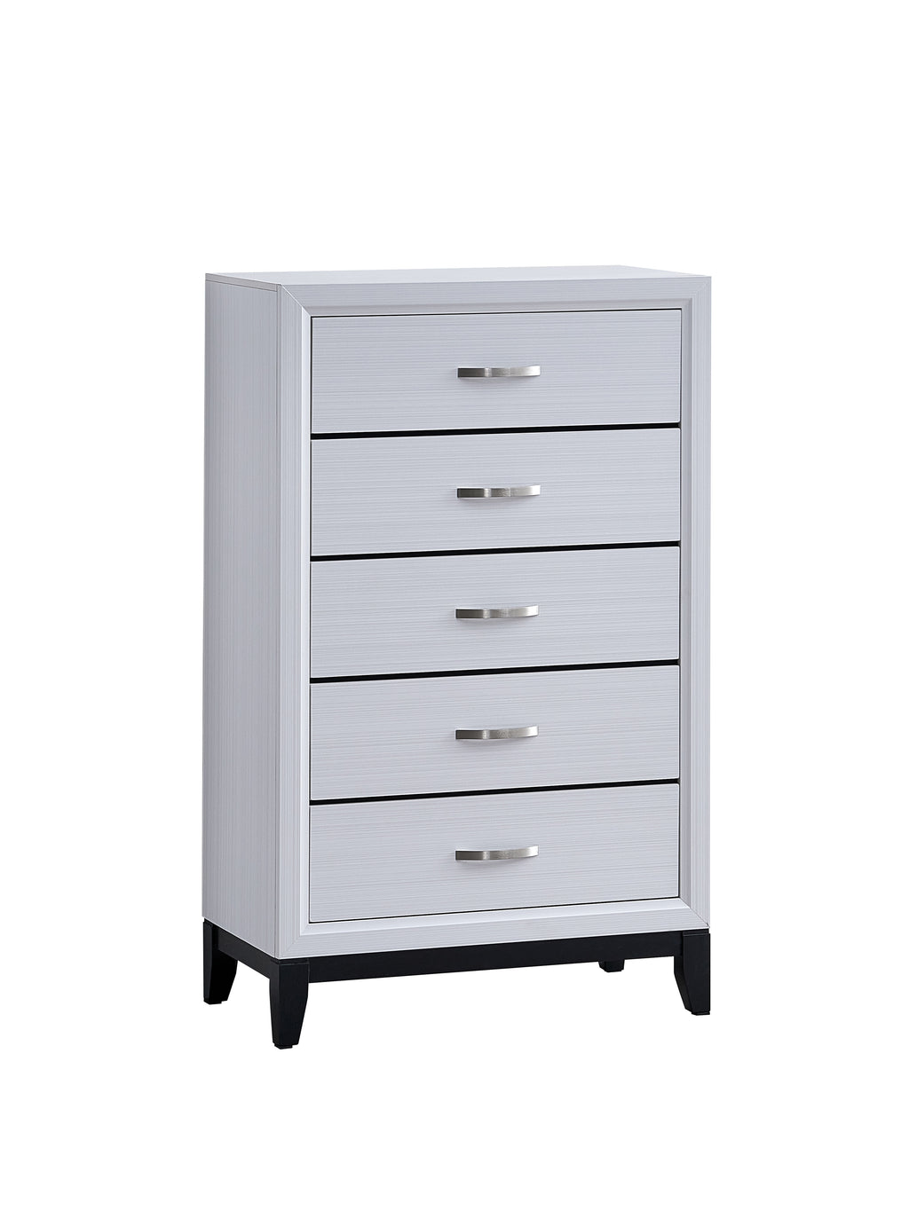 Enhance your bedroom aesthetics with our White Dresser. This piece features a sleek white finish enhanced by subtle wood grain details, ensuring it blends seamlessly with your decor. It offers five spacious drawers, providing ample room for your clothing and accessories. The dovetail drawer construction guarantees durability and smooth operation, while center-mounted drawer glides ensure effortless access. The dresser is accented by brush steel handles, which introduce a modern flair to the design. For a harmonious setup, consider complementary items such as a matching nightstand or chest. Please note: Mirror Not Included.