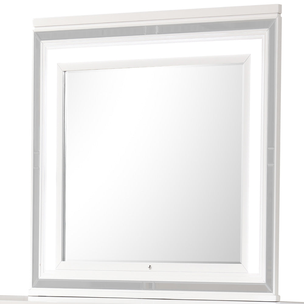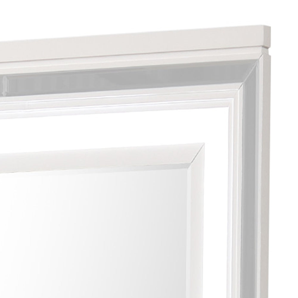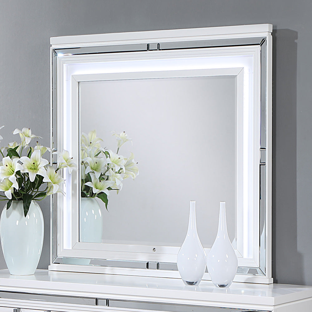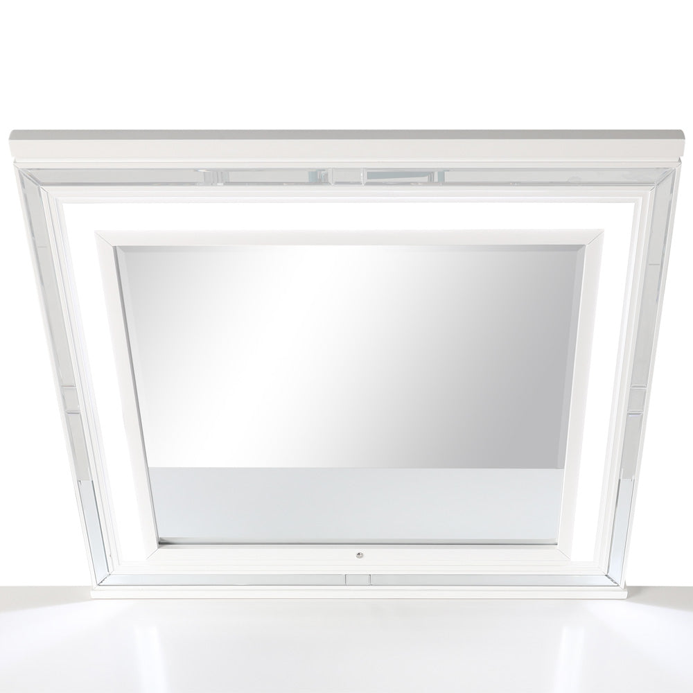 Modern Design Mirror Adds Scale to this Deco Bedroom. High Quality Low Distortion Glass and Mirror Trim Strips are Accented by the LED Lighting that is Included. Mirror Supports are not supplied as they Ship with the Matching Dresser.