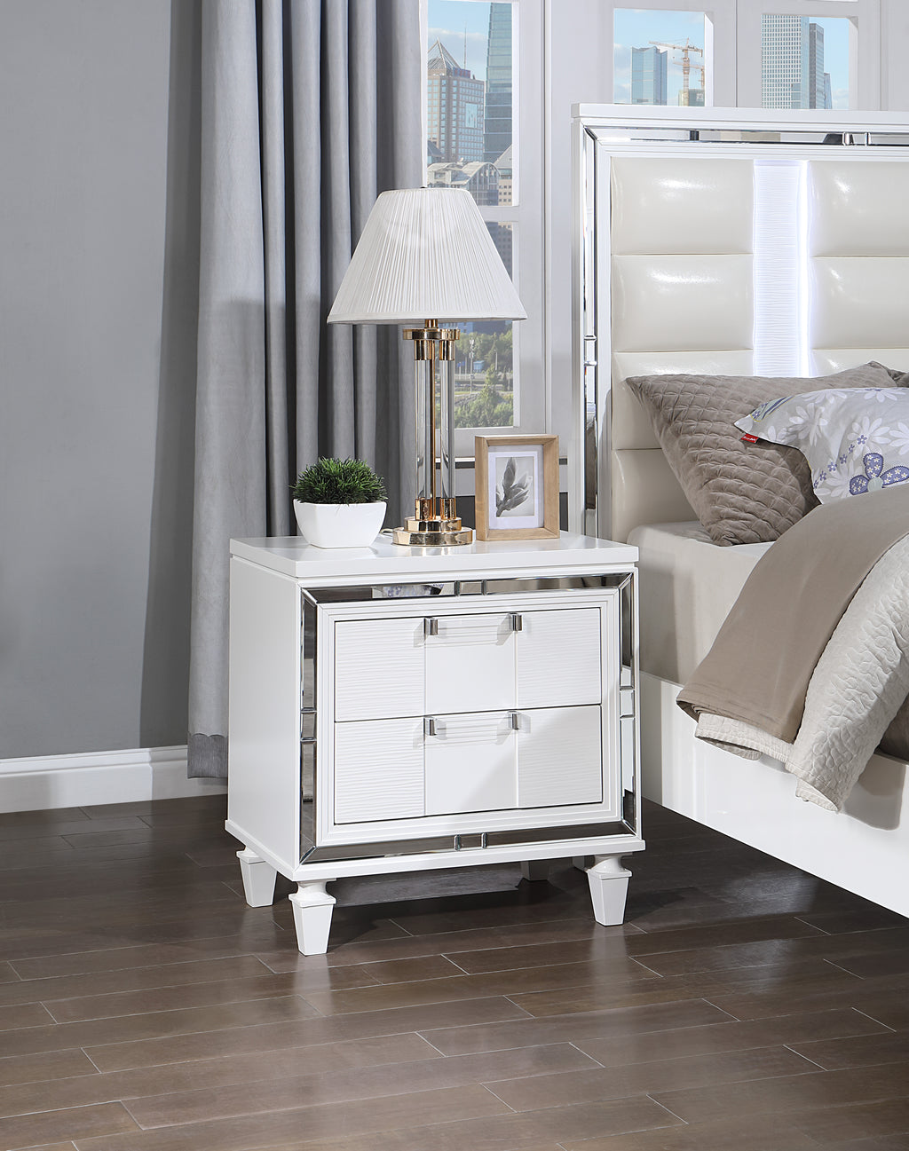 A Stunning Bedroom that Features Wood Emboosed Fronts on the Dresser,Chest and Nightstand with Full Extension Drawers and Mirror Accents . Acrylic and Chrome handles add a Modern Deco Feel and Tapered Legs carry through the Unique Design Cues . Felt Lined Top Drawers Provide a No Snag Home for your Clothes
