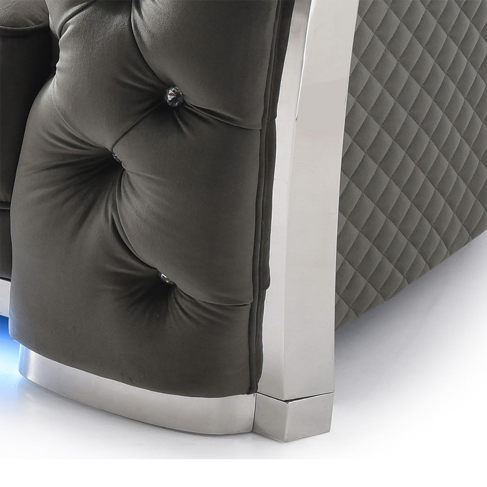 Make a bold statement in your living space with this striking sofa designed to combine comfort, glamour, and modern appeal. The deeply tufted back and arms create a rich, textured look that instantly elevates the room, while the plush seat cushions provide inviting comfort for everyday lounging. Its wide, enveloping silhouette offers a cozy seating experience that feels both luxurious and welcoming. A subtle illuminated base adds a contemporary touch, creating a floating effect that enhances the sofa’s dramatic presence without overwhelming the space. Thoughtfully proportioned, this sofa works beautifully as a centerpiece in living rooms, lounges, or entertainment areas. Whether you’re hosting guests or relaxing at home, it delivers standout style paired with practical, everyday comfort.