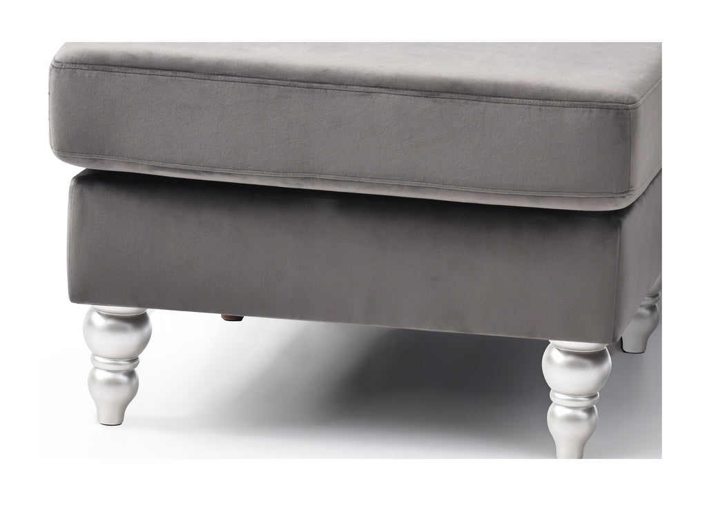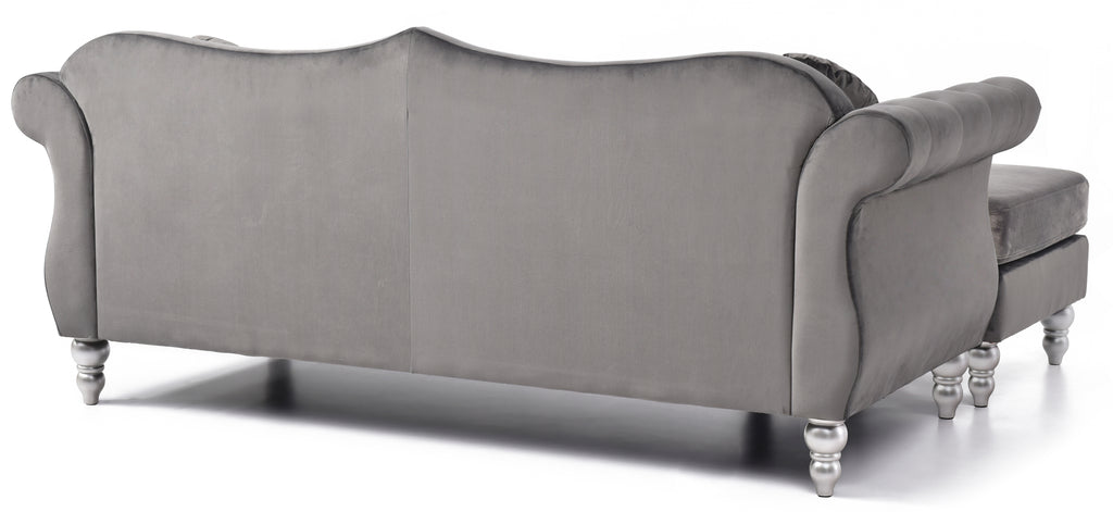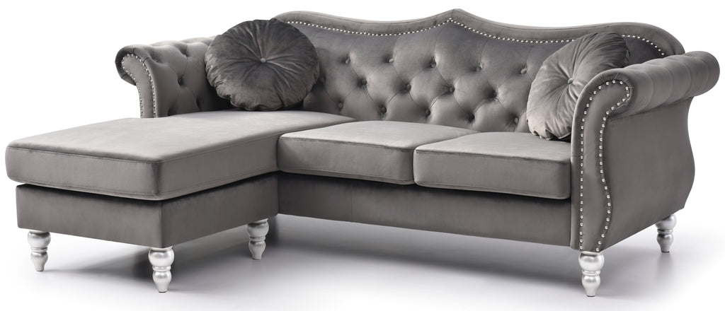 Updated Transitional Sectional with Tufted Velvet Cover, Hand Applied Nailheads, Turned Wood Feet as Well as 2 Matching Throw Pillows. Chaise can be set Up Right or Left Facing. Sofa, Loveseat and Chair also Available