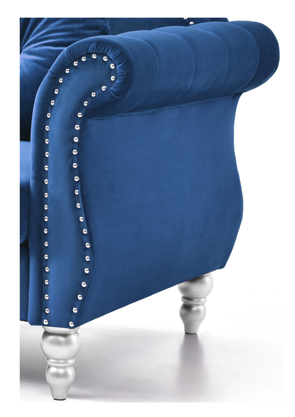 Updated Transitional Sectional with Tufted Velvet Cover, Hand Applied Nailheads, Turned Wood Feet as Well as 2 Matching Throw Pillows. Chaise can be set Up Right or Left Facing. Sofa, Loveseat and Chair also Available