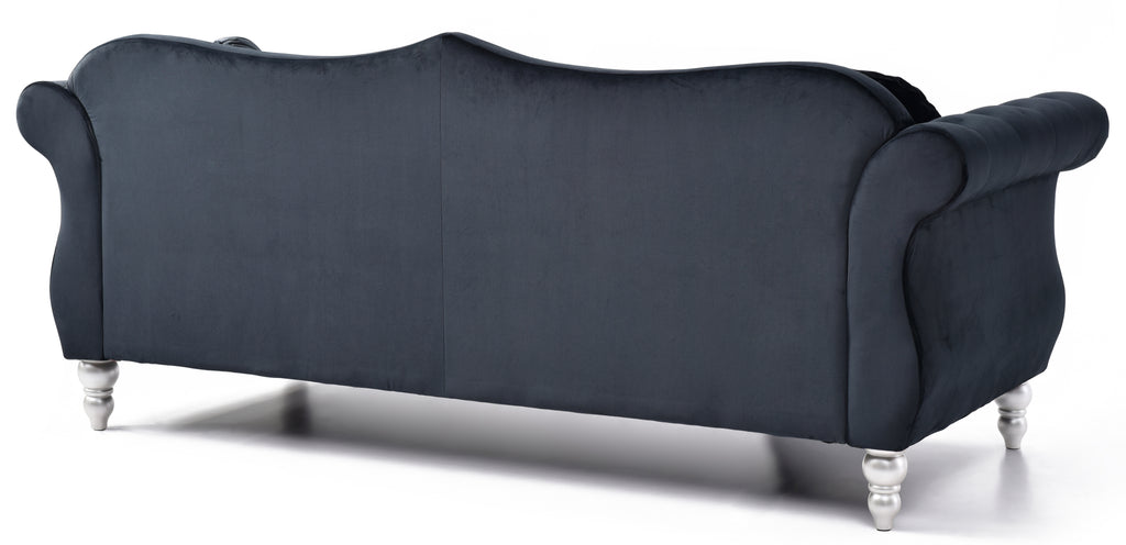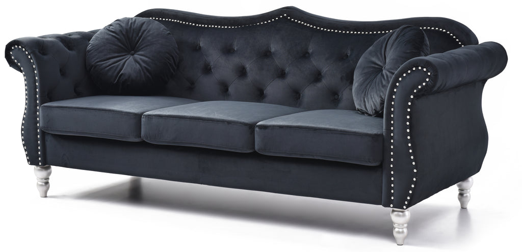 Updated Transitional Look with Tufted Velvet Cover, Hand applied Nailheads, Turned Wood Feet as Well as 2 Matching Throw Pillows. Choose from Sofa. Loveseat, Chair or Sectional