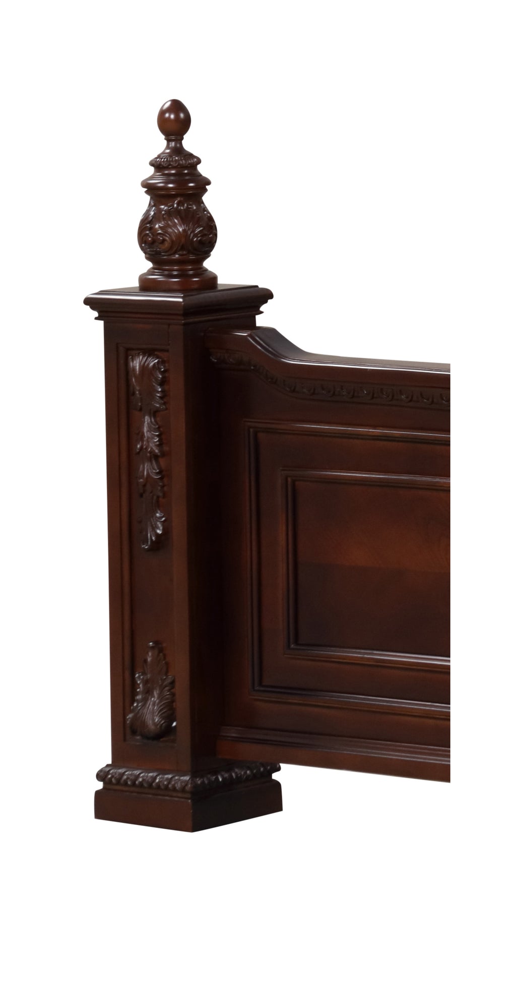 This bed showcases timeless craftsmanship with its grand, sculpted headboard and matching footboard, each adorned with intricate carved detailing. The towering posts and ornamental finials add a stately presence, creating a centerpiece that elevates any traditional bedroom setting. Built with a solid, durable structure, this bed blends elegance and strength, making it a standout choice for those who appreciate classic, upscale design.