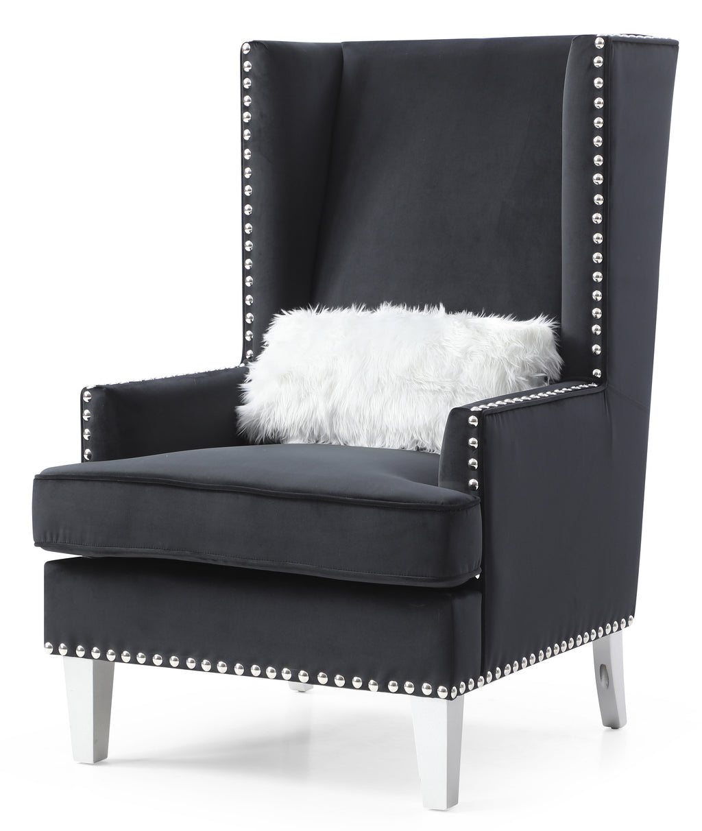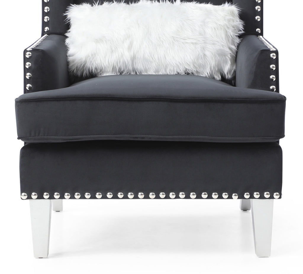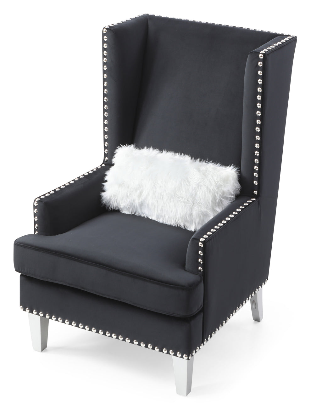 This elegant wingback accent chair elevates any room with its tall, sculpted silhouette and plush velvet upholstery. Shimmering nailhead trim outlines the arms, wings, and base, adding a refined touch of glamour. Supported by sleek tapered legs and finished with a soft faux-fur lumbar pillow, it offers both comfort and statement-making style.
