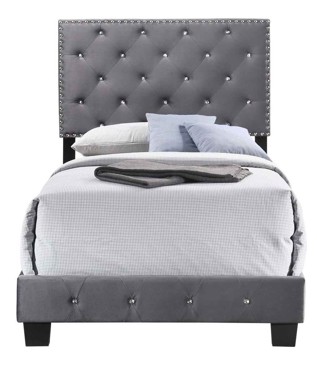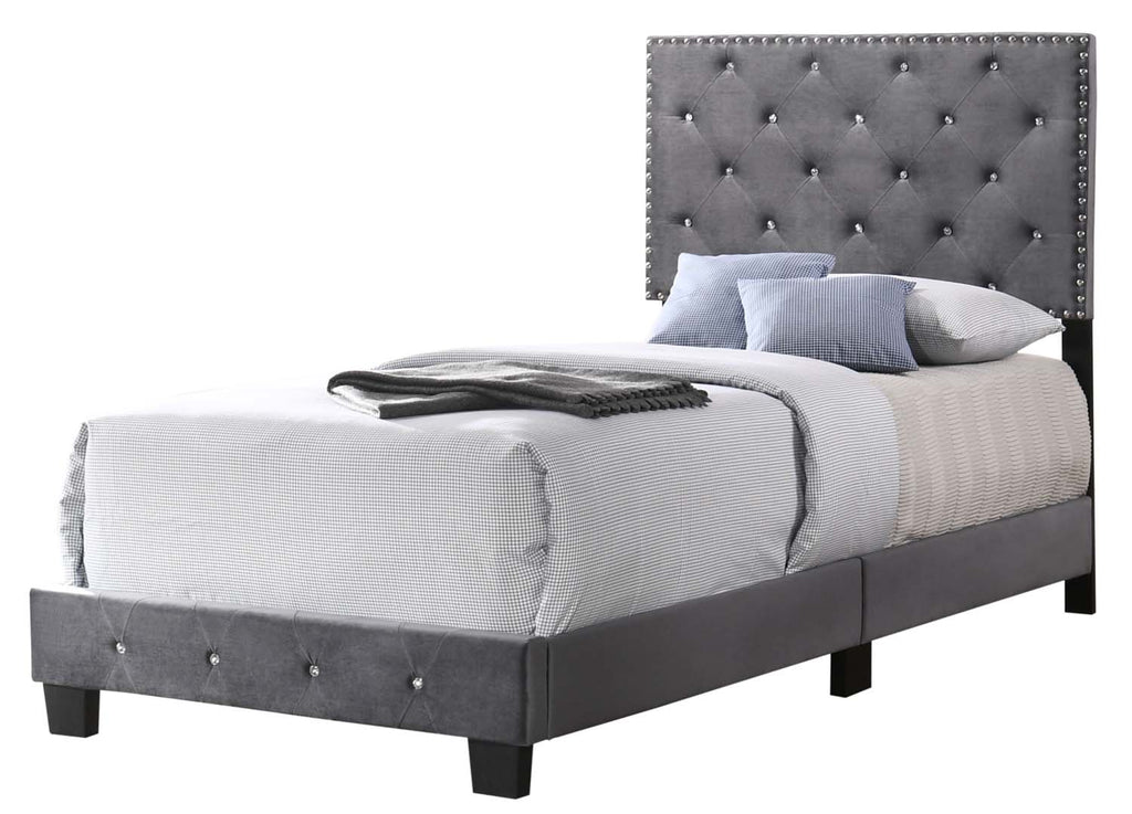 Elevate your bedroom with this beautifully crafted bed featuring a deep tufted upholstered headboard and footboard that bring a luxurious, tailored look to your space. Wrapped in soft velvet with sparkling jeweled tufting, it adds a touch of glamour from every angle. Chrome nail heads outline the silhouette for a refined finish, while sturdy wood supports ensure lasting durability. Designed for use with a box spring or foundation, this bed blends elegance, comfort, and stability in one stunning centerpiece.