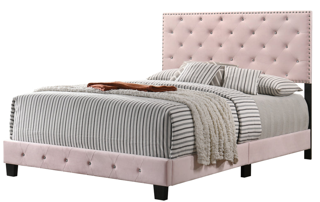Elevate your bedroom with this beautifully crafted bed featuring a deep tufted upholstered headboard and footboard that bring a luxurious, tailored look to your space. Wrapped in soft velvet with sparkling jeweled tufting, it adds a touch of glamour from every angle. Chrome nail heads outline the silhouette for a refined finish, while sturdy wood supports ensure lasting durability. Designed for use with a box spring or foundation, this bed blends elegance, comfort, and stability in one stunning centerpiece.