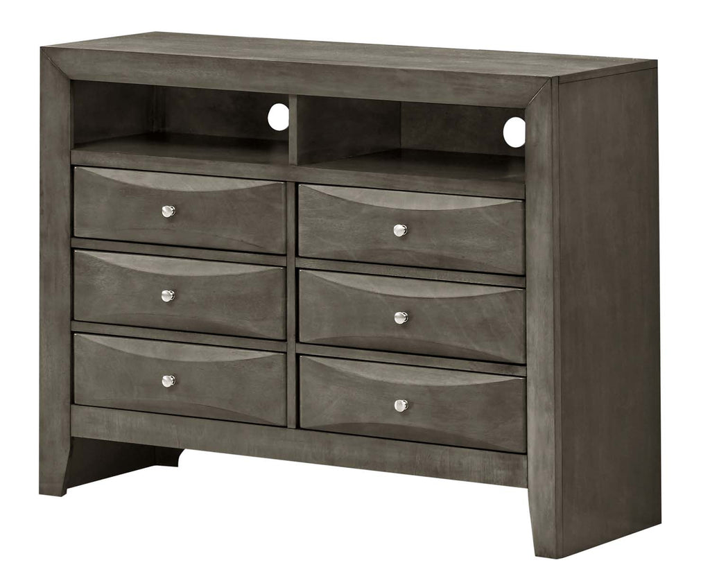 Bring clean lines and practical storage into your space with this sleek multi-drawer dresser. Designed with a strong, structured silhouette, it offers a balanced look that feels both modern and timeless. Six spacious drawers provide ample room to organize clothing, accessories, or household essentials, helping keep your space neat and clutter-free. An open upper shelf adds convenient access for everyday items or electronics, making this piece ideal for bedrooms, living rooms, or media setups. The smooth drawer fronts create subtle visual movement, adding depth without overwhelming the design. Thoughtful proportions ensure it feels substantial while fitting comfortably into a variety of room sizes. This versatile dresser is a smart solution for anyone looking to combine storage, style, and everyday functionality in one refined piece.