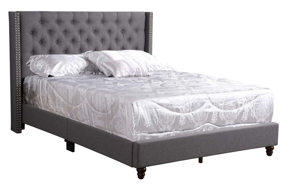 This bed brings a bold, stylish presence to any bedroom with its plush tufted headboard and gracefully curved silhouette. Decorative nailhead accents outline the headboard for an added touch of elegance, while the low-profile frame and turned front legs create a refined, balanced look. A perfect blend of comfort and standout design for a modern or chic space.
