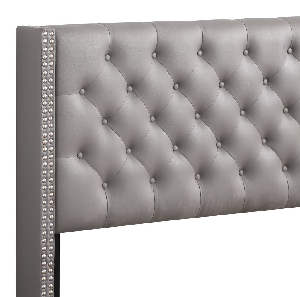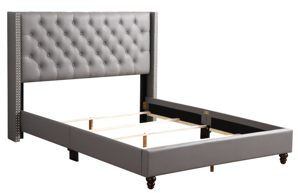 This bed brings a bold, stylish presence to any bedroom with its plush tufted headboard and gracefully curved silhouette. Decorative nailhead accents outline the headboard for an added touch of elegance, while the low-profile frame and turned front legs create a refined, balanced look. A perfect blend of comfort and standout design for a modern or chic space.