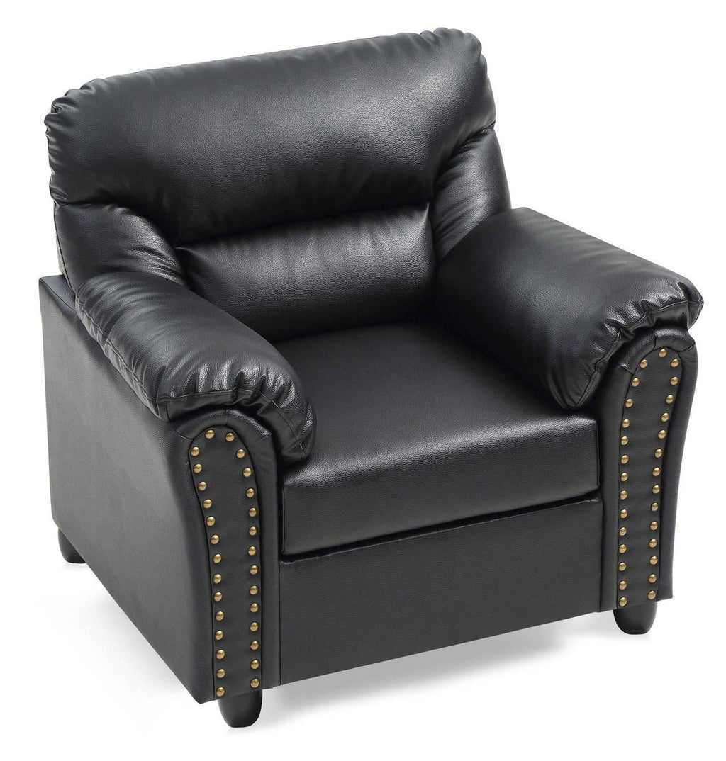 This black accent chair brings together classic styling and everyday comfort, making it a versatile addition to living rooms, offices, or entertainment spaces. The generously padded back, arms, and seat create a plush, sink-in feel, while the rolled armrests give it a timeless, traditional look. Antique-brass nailhead trim highlights the front arms, adding a touch of craftsmanship and visual detail that elevates the overall design. Durable upholstery and sturdy wooden feet ensure lasting support, making this chair as reliable as it is stylish.