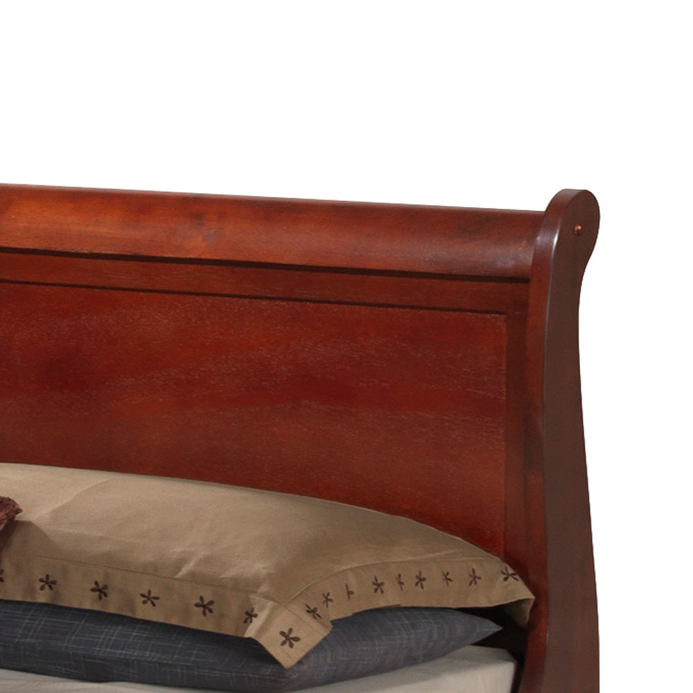 This classic sleigh bed features gracefully curved panels and warm wood tones that bring timeless elegance to your bedroom. The sturdy frame offers reliable support, while two built-in footboard drawers provide convenient storage for blankets, linens, and everyday essentials. A perfect blend of traditional style and practical function.