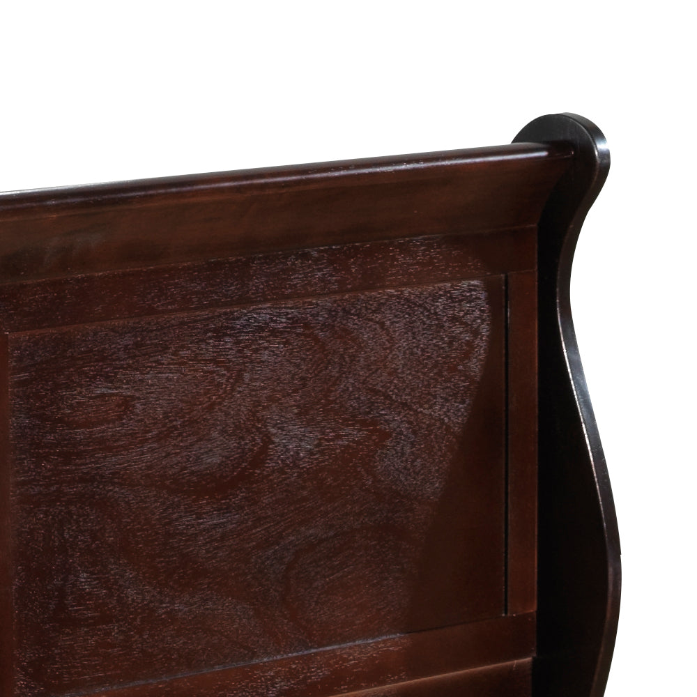This sleigh bed combines timeless curves with practical everyday function. The gently rolled headboard and footboard create a classic silhouette, offering a graceful presence that elevates any bedroom. Beneath the frame, a spacious pull-out trundle provides an additional sleeping area, making it ideal for guests, shared rooms, or maximizing space in smaller homes. The smooth panels and clean lines highlight its traditional craftsmanship, while the sturdy construction ensures lasting durability. This bed brings together elegance and convenience, offering both style and smart storage without overwhelming the room.