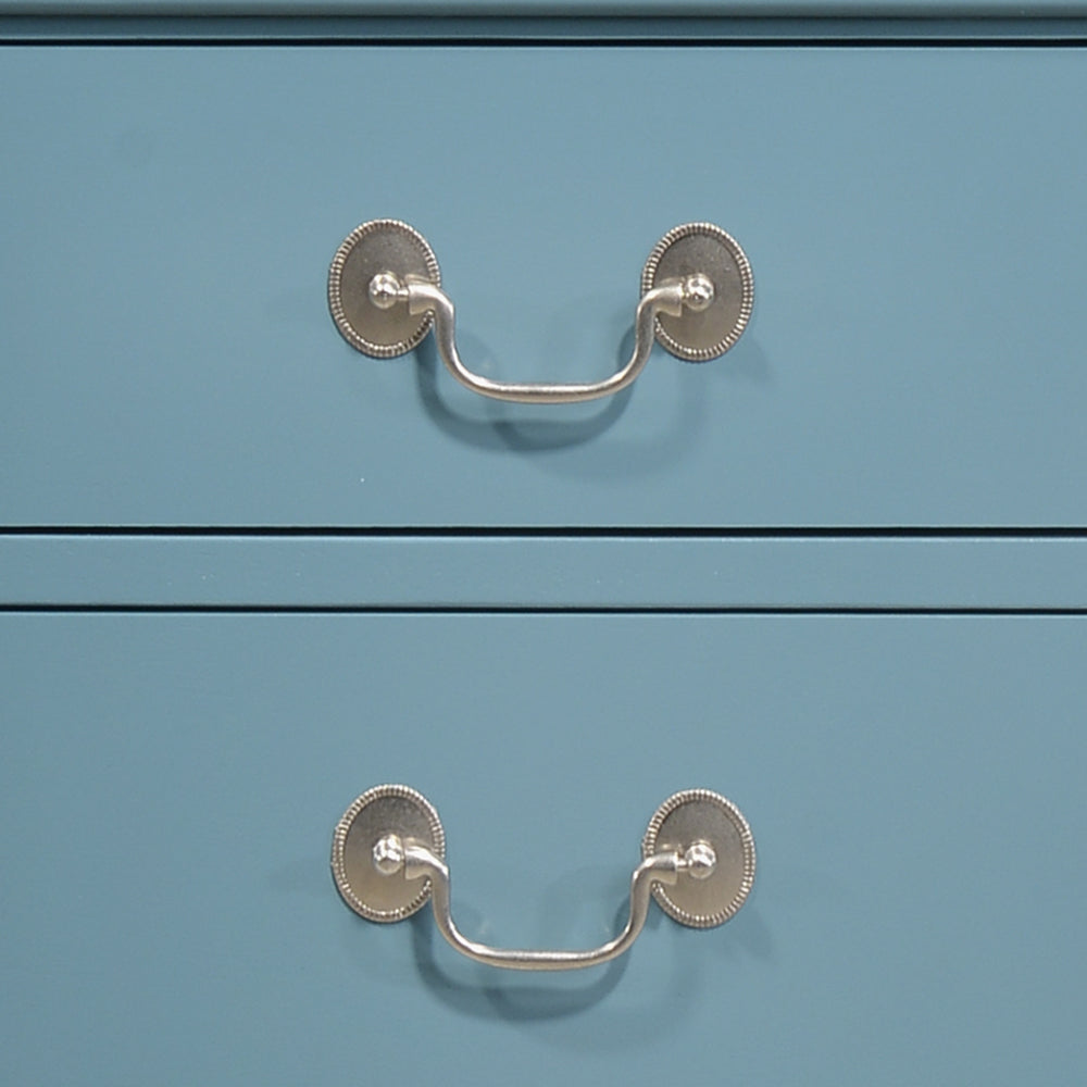 - Smooth drawer fronts with classic pull handles for easy opening and closing