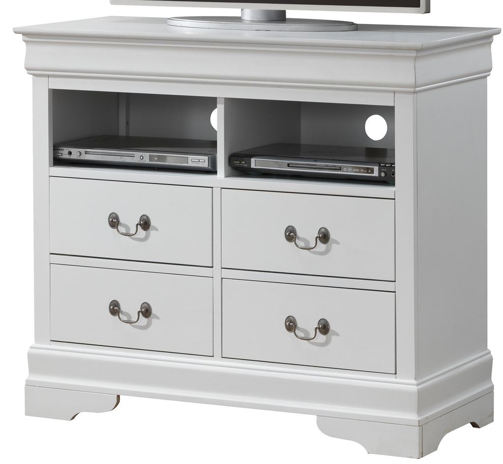 Add functional storage and classic character to your space with this versatile media dresser. Designed with a balanced, furniture-forward silhouette, it offers both open and concealed storage to keep your room organized and visually clean. Two open upper compartments provide easy access for media devices, décor, or everyday essentials, while four spacious drawers below offer ample room to store clothing, accessories, or household items out of sight. The structured frame and clean drawer layout create a timeless look that fits comfortably in bedrooms, living rooms, or multipurpose spaces. Thoughtful proportions give this piece a solid presence without overwhelming the room, making it a practical and stylish solution for everyday organization.