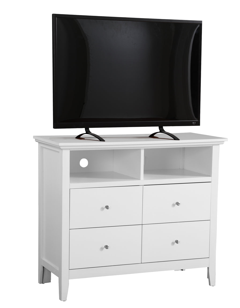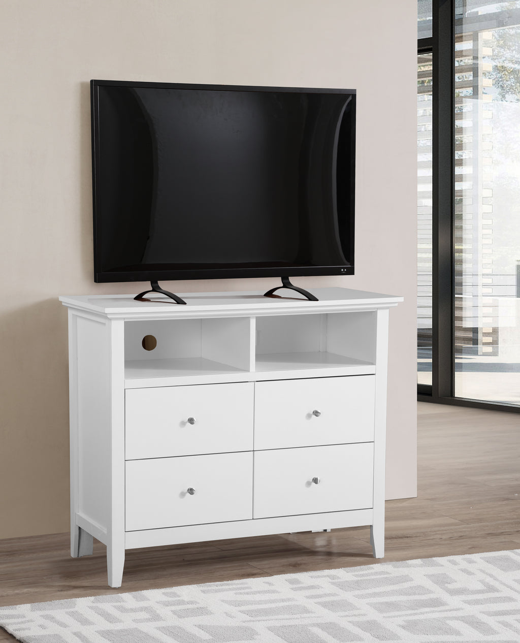 Brighten your space with this versatile dresser designed to balance storage and style effortlessly. Its clean lines and structured silhouette create a fresh, timeless look that fits comfortably into bedrooms, guest rooms, or living areas. Four spacious drawers provide ample room to organize clothing, linens, or everyday essentials, helping keep your space neat and clutter-free. The open upper compartments add functional flexibility, offering a convenient spot for décor, books, or media components, while built-in cord access keeps cables organized and out of sight. Thoughtful proportions give this piece a sturdy presence without overwhelming the room, making it ideal for both small and medium-sized spaces.